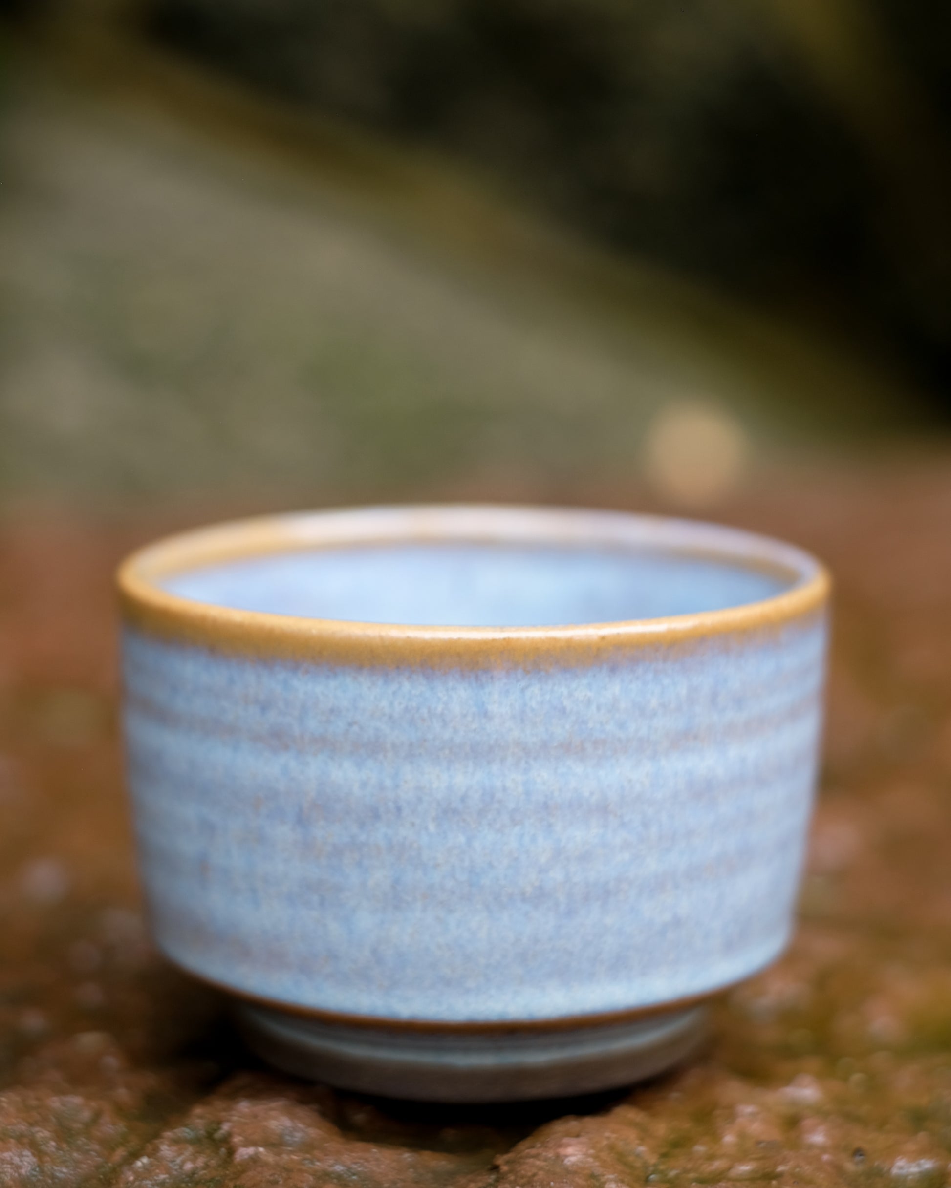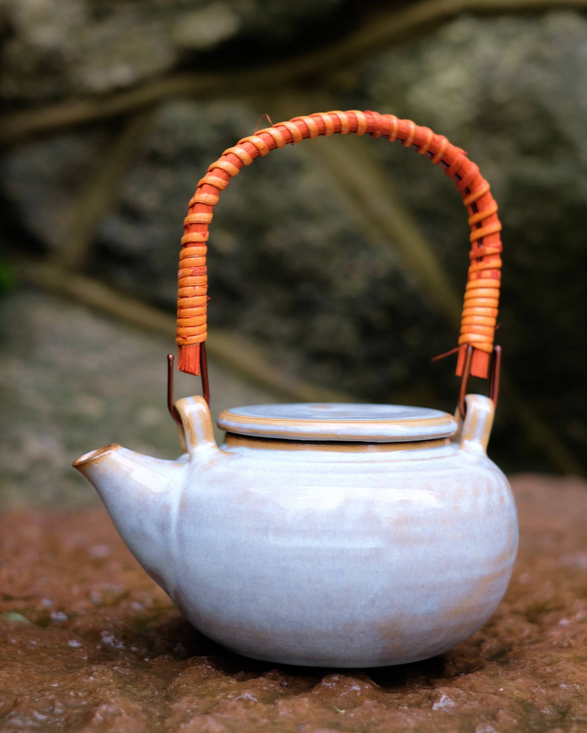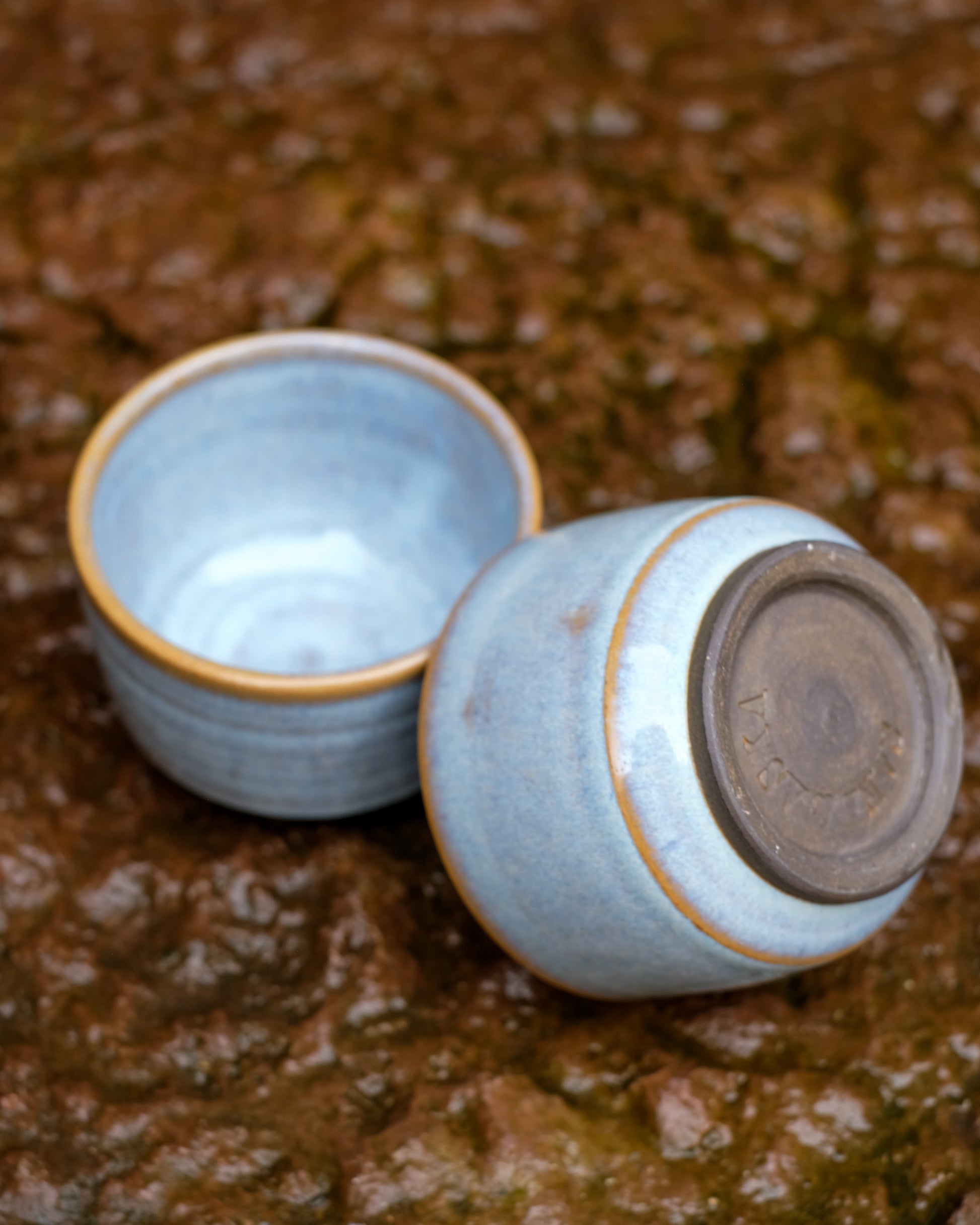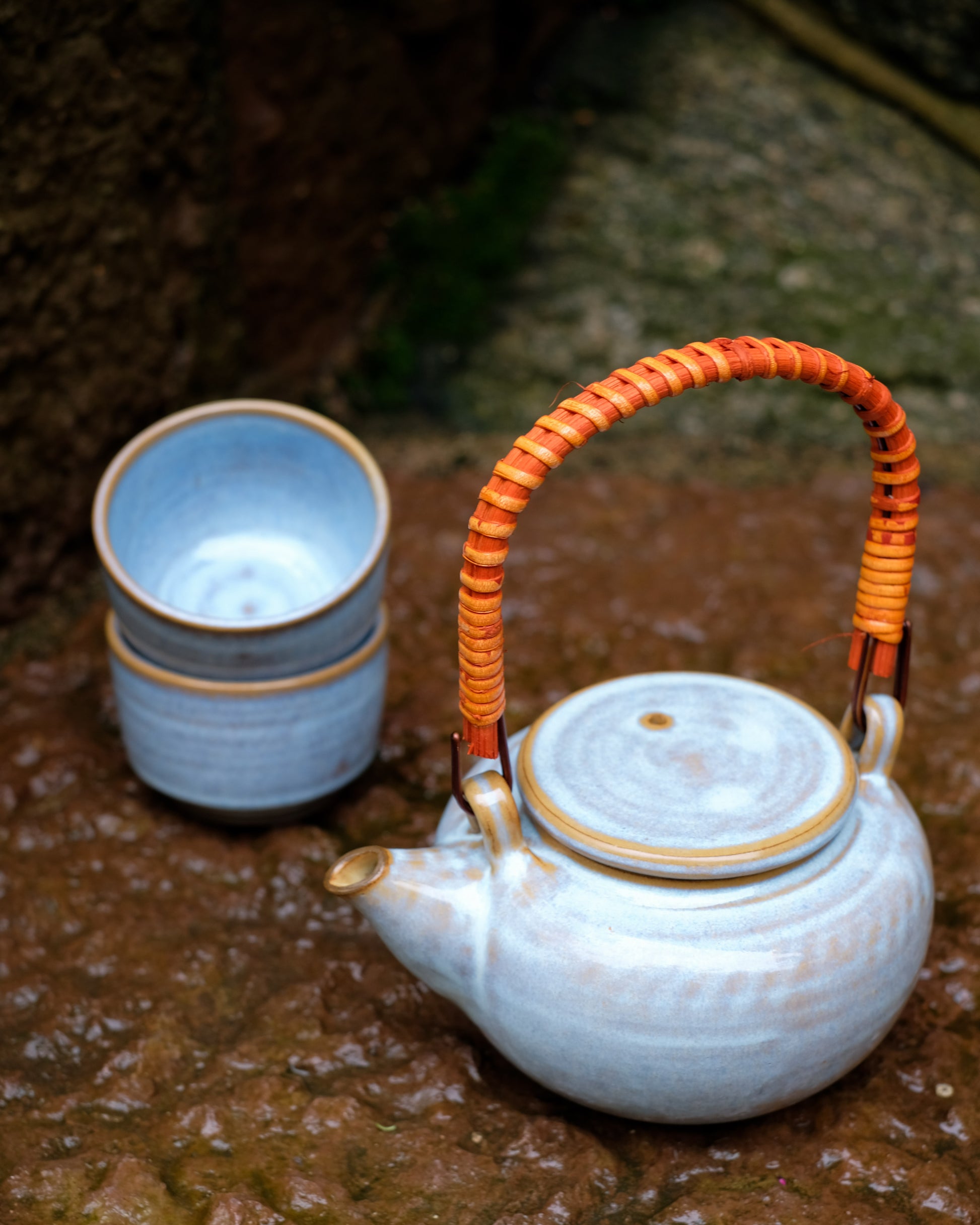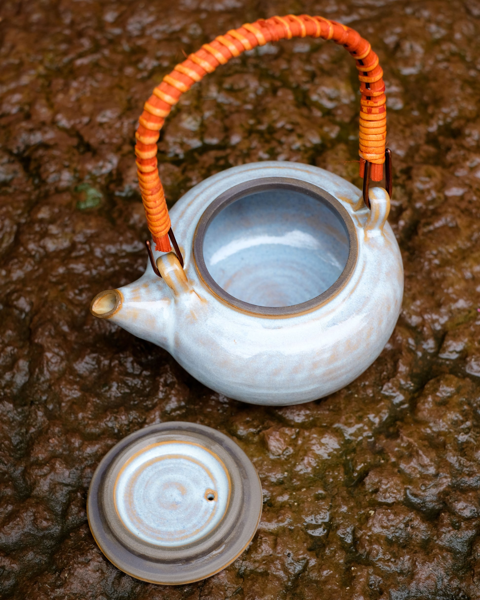 Tekanna som rymmer ca 5 dl. Inbyggda tebladsstopp ut mot pipen. Två små tillhörande koppar drejade med tjockare kant för att de ska gå bättre att hålla i utan öra. Kopparna rymmer 1-1.5 dl. Alla delar är drejade i svart lera och glaserade med en himmelsblå glasyr med gyllene skiftningar. Tekanna och koppar säljs ihop som set.
