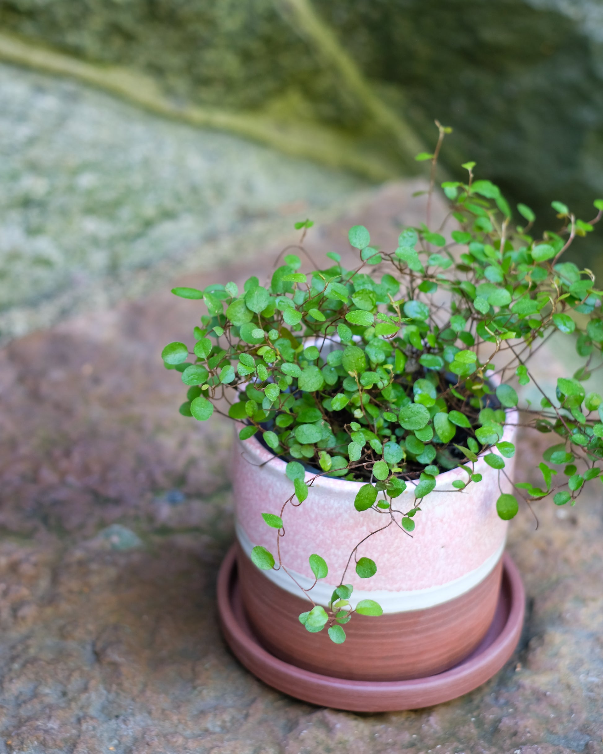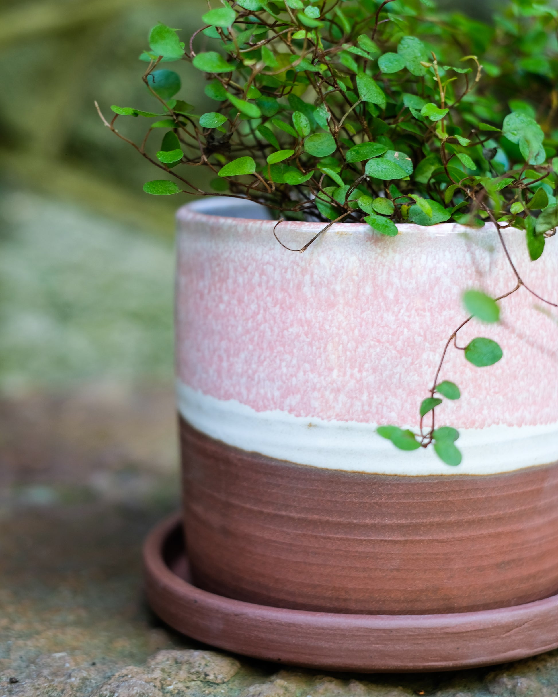 Drejad kruka med fat i röd stengodslera. Dräneringshål i botten. Glaserad i en kombination av vit och rosa glasyr. Höjd: ca 12.5 cm. Diameter: ca 12.5 cm
