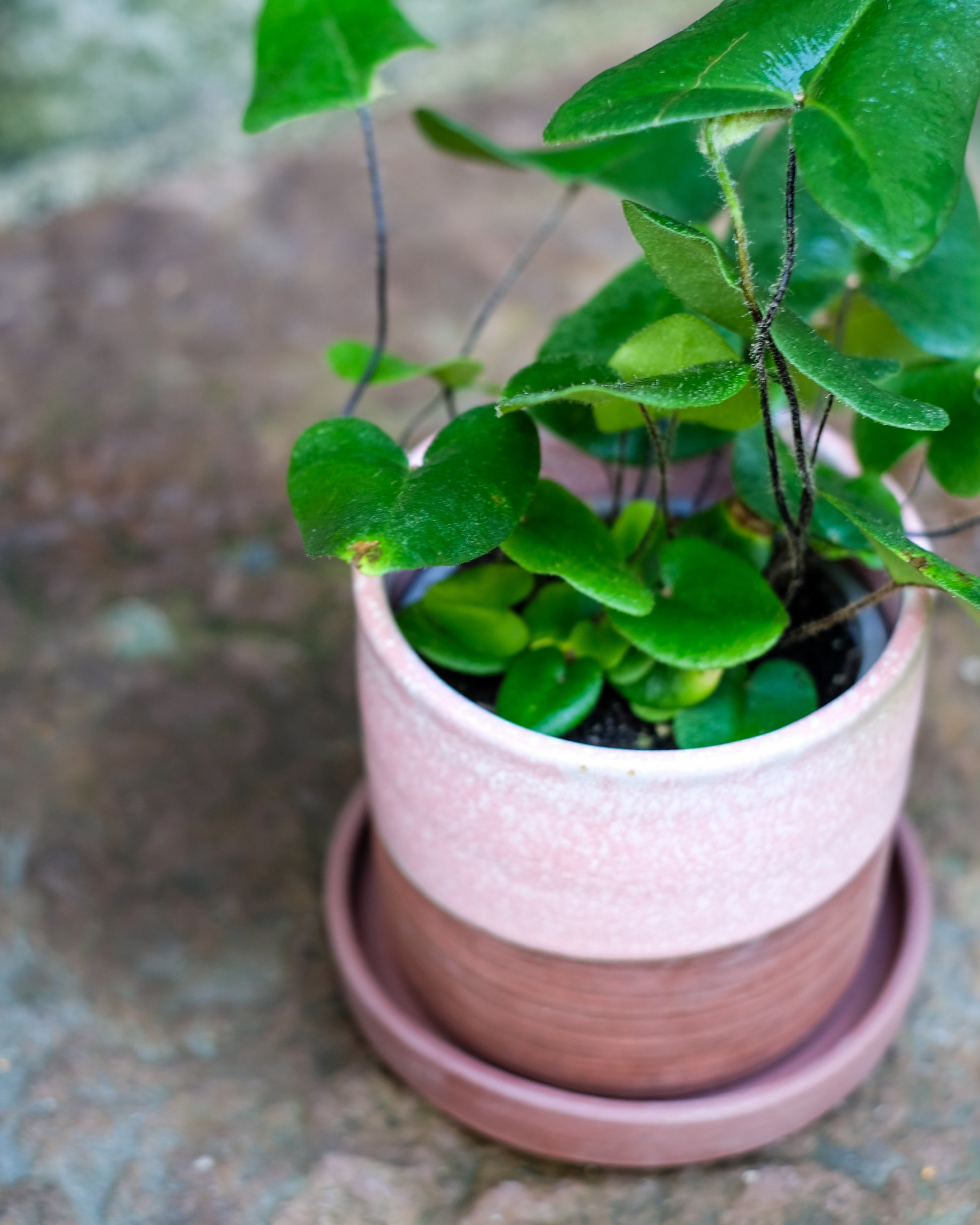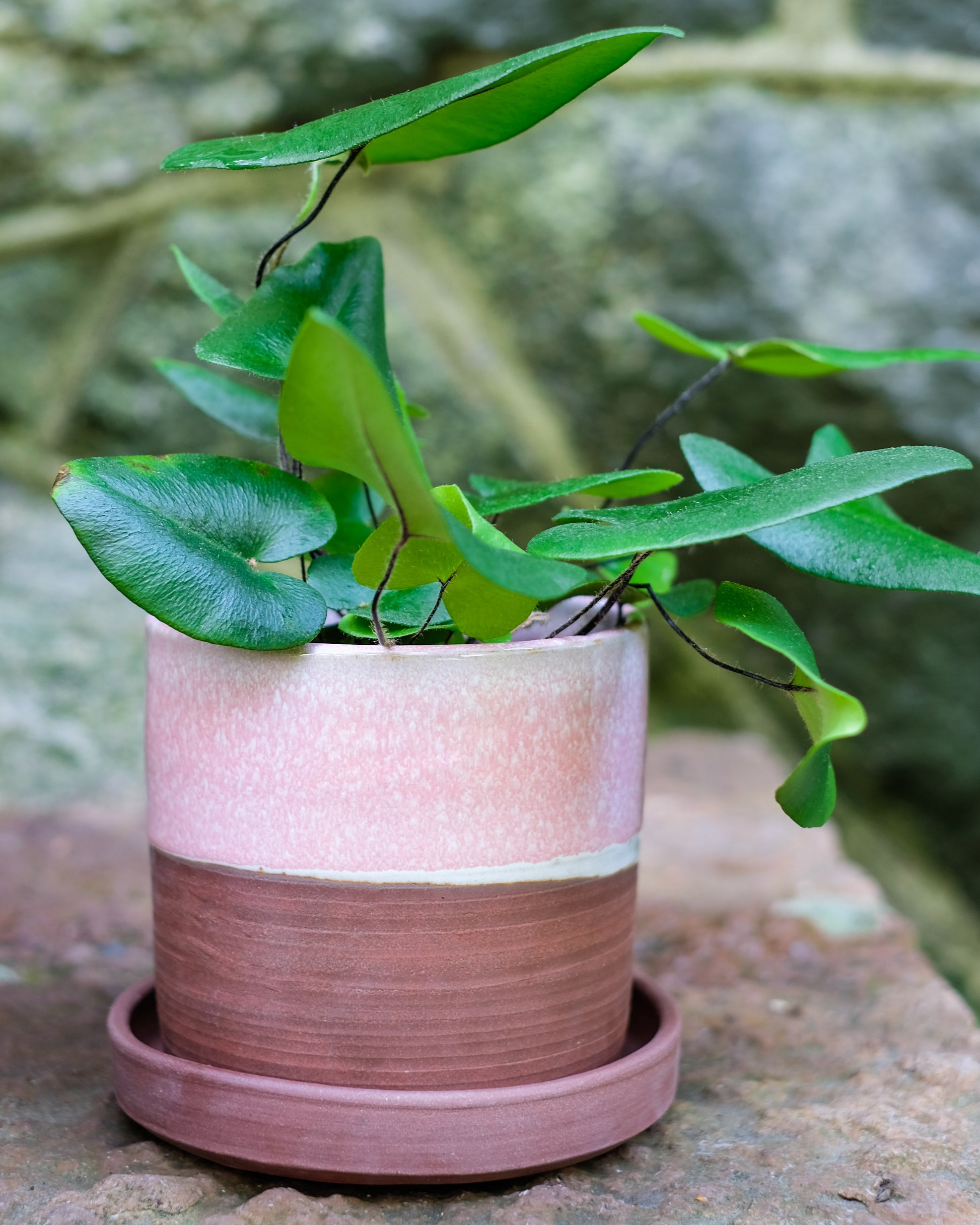 Drejad kruka med fat i röd stengodslera. Dräneringshål i botten. Glaserad i en kombination av vit och rosa glasyr. Höjd: ca 12.5 cm. Diameter: ca 12.5 cm.