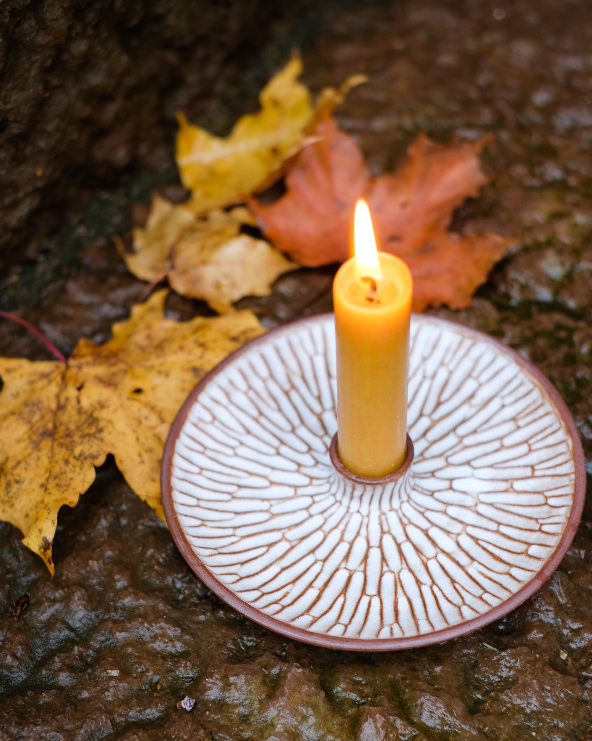 Drejad ljusstake i röd stengodslera. Karvad och glaserad i vit matt glasyr.
