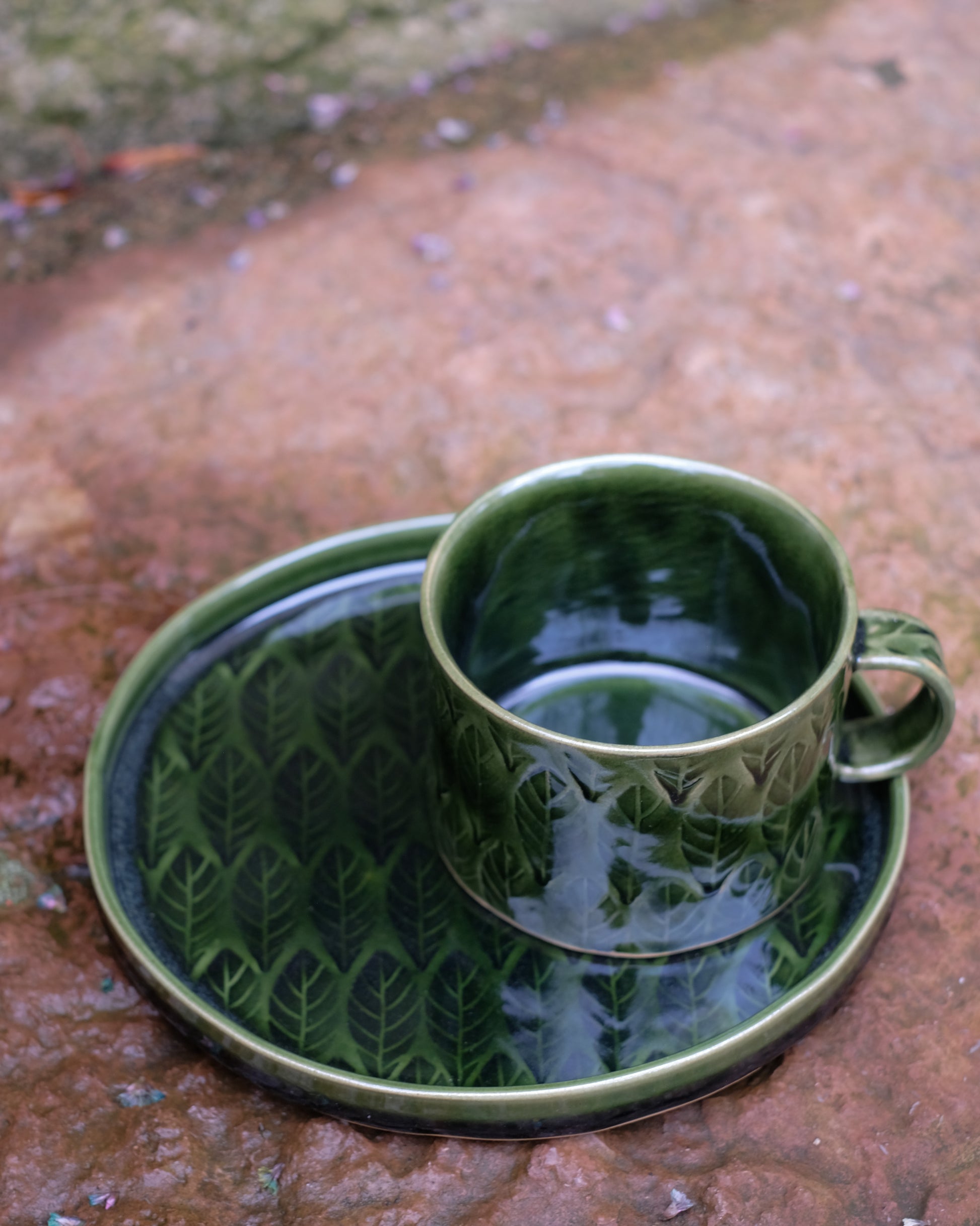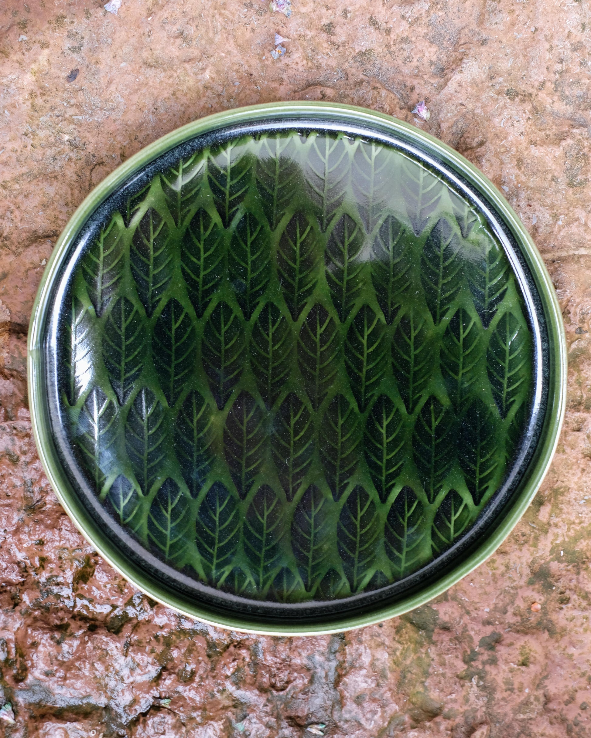 Kavlad lövkopp och lövfat i stengodslera. Pinjegrön glasyr. Går fint att köra i mikro och dismaskin.