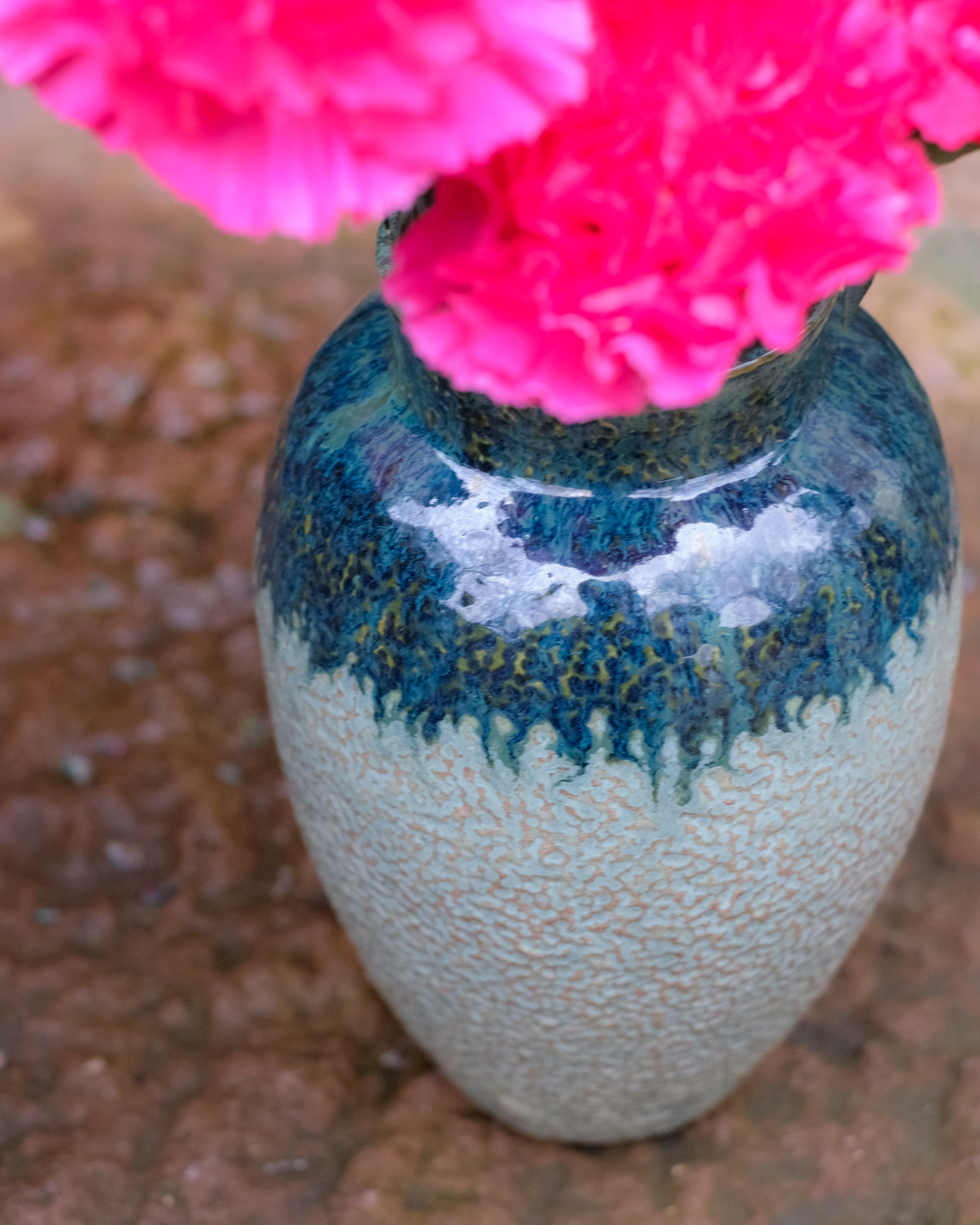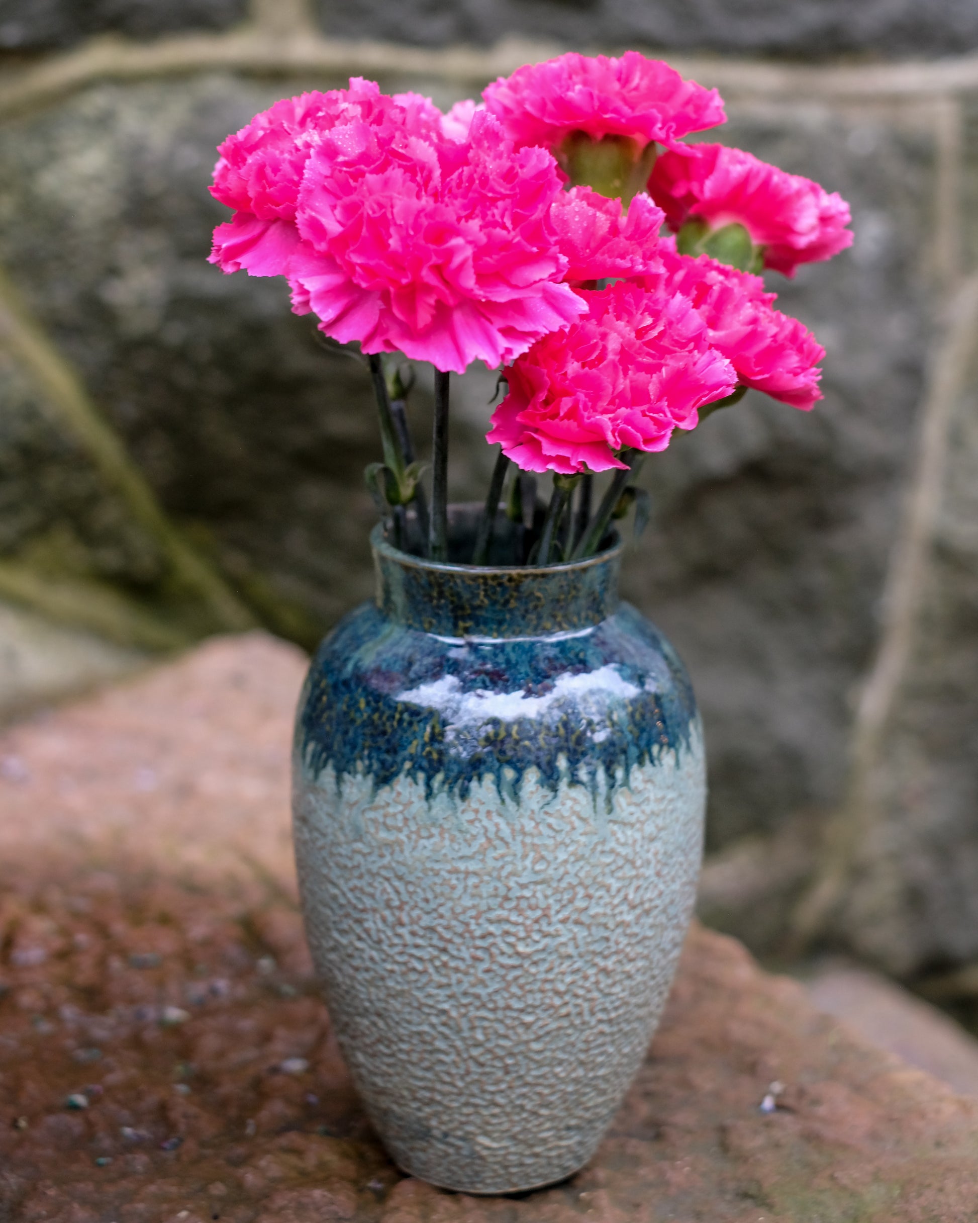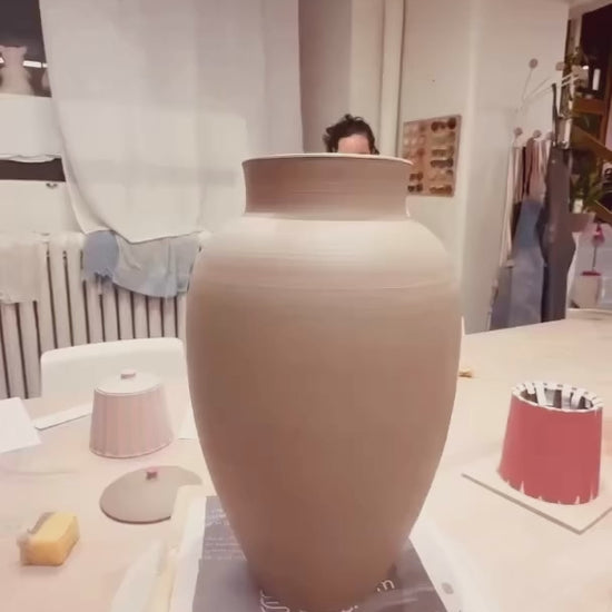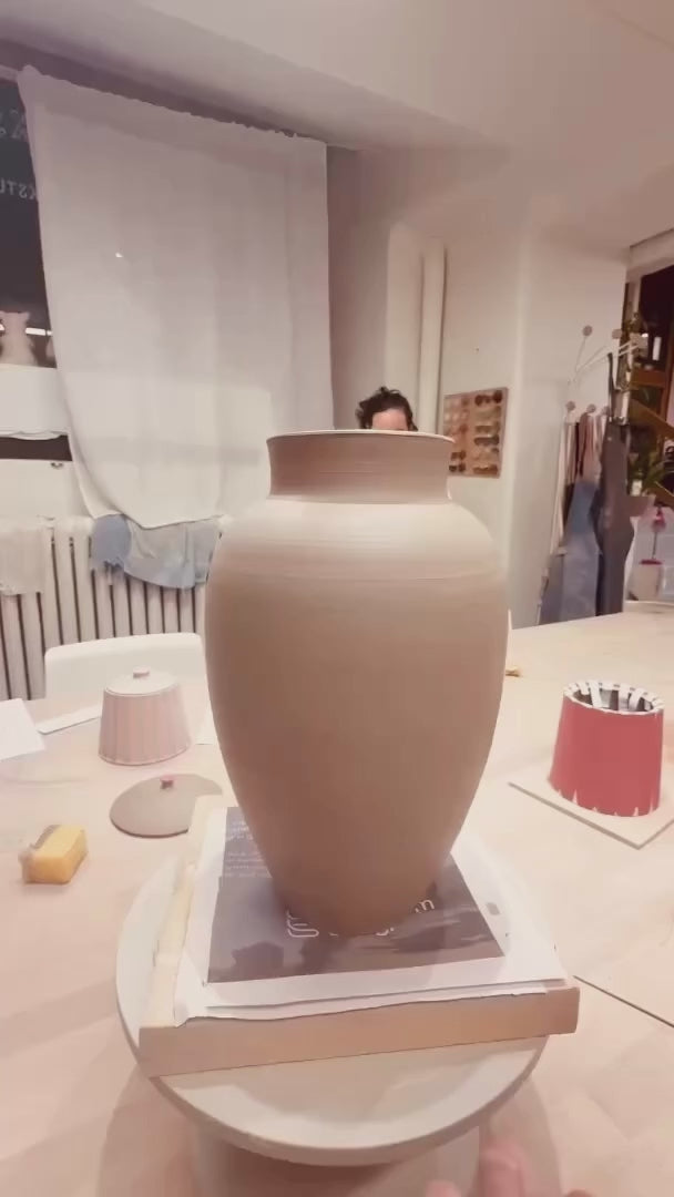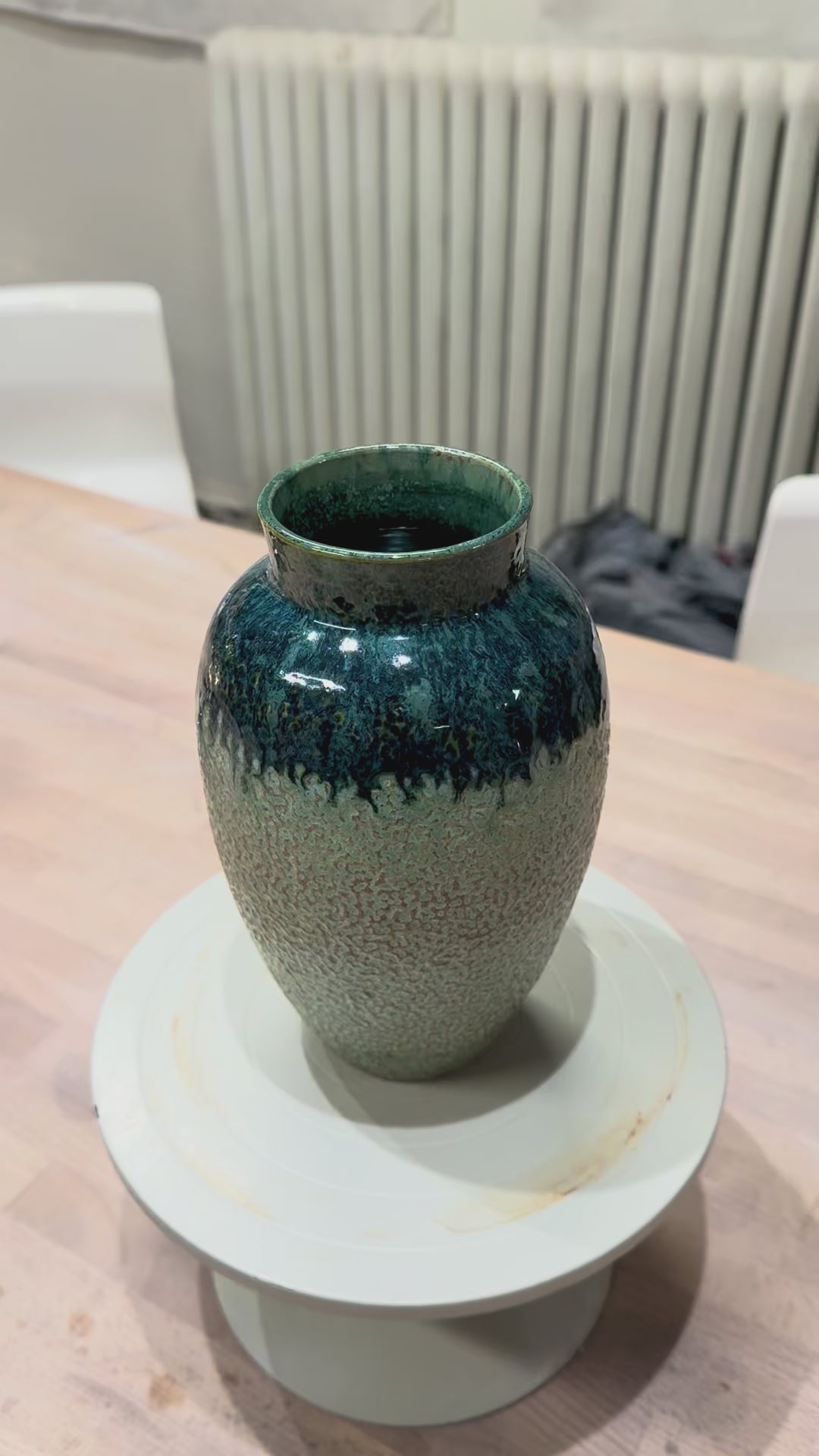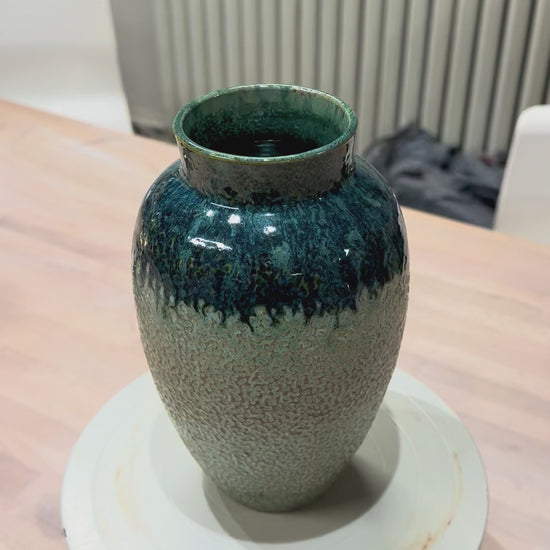 Drejad vas i ljus stengodslera. Knackad ytstruktur. Glaserad i två olika gröna glasyrer. Höjd ca 20 cm.