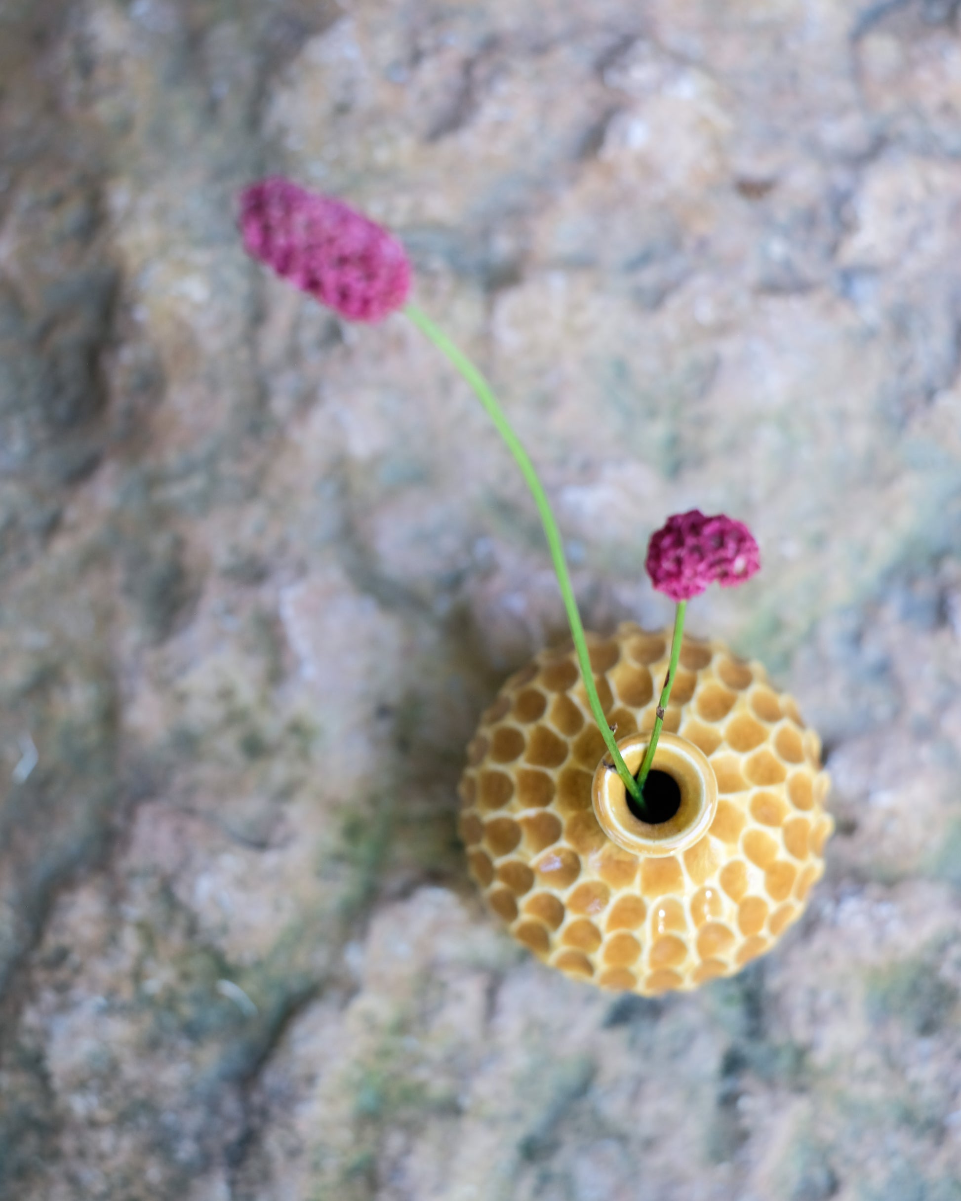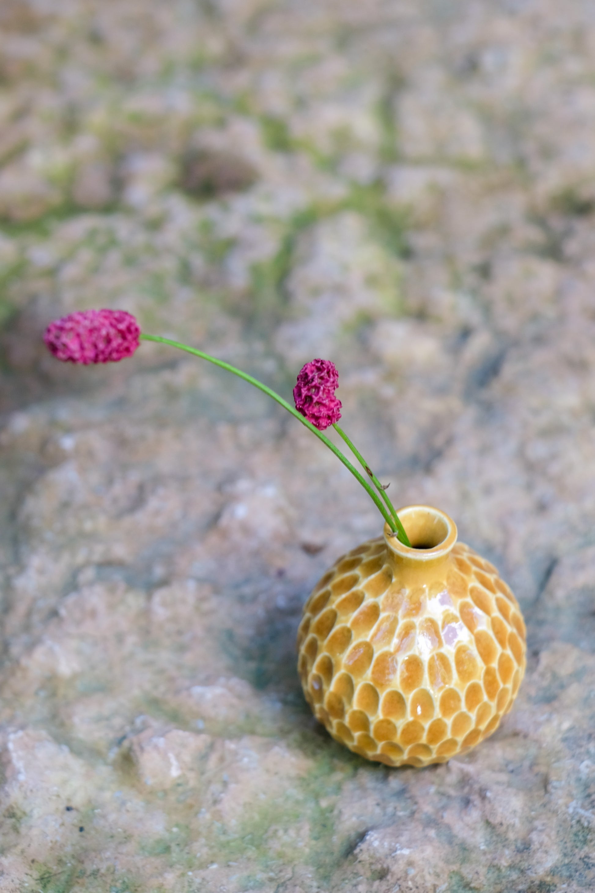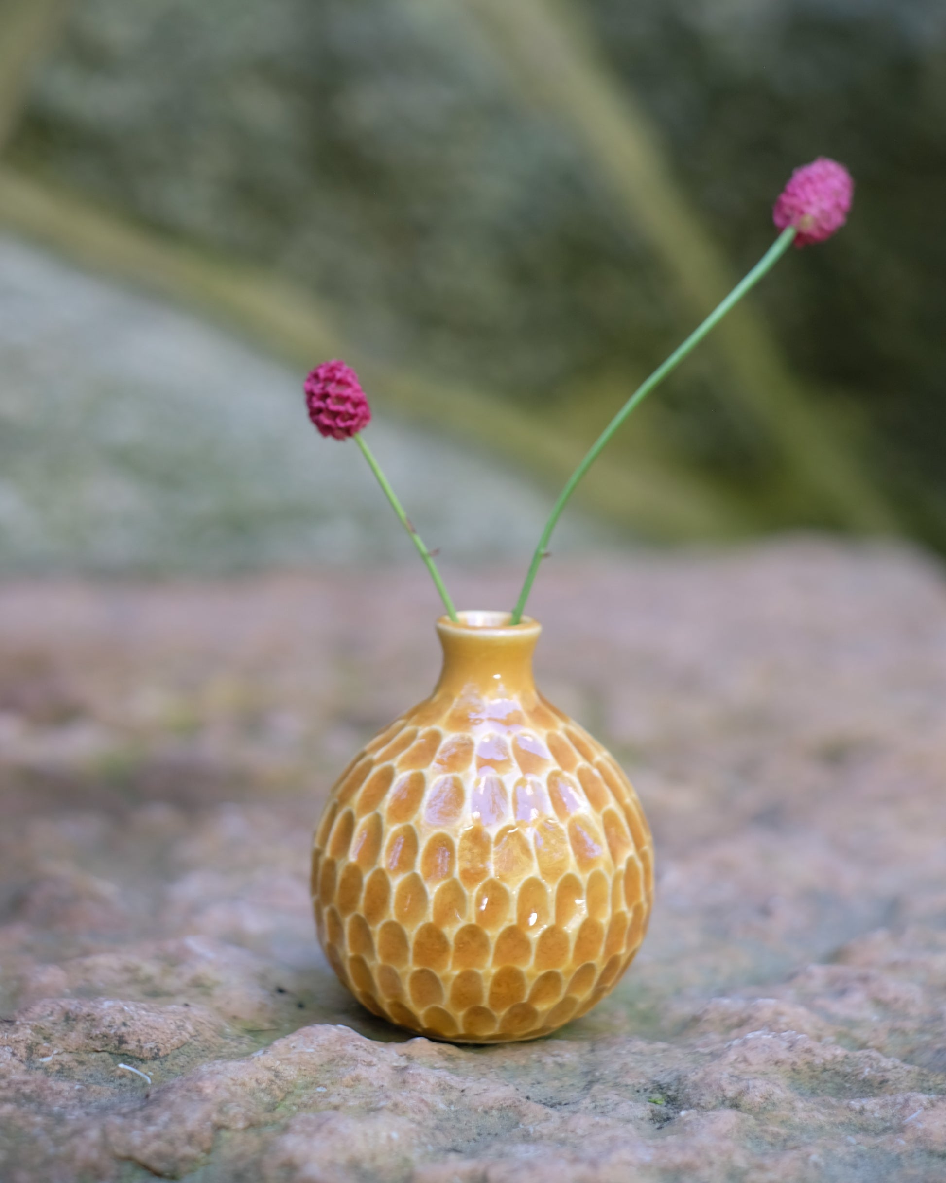 Drejad liten vas med handkarvat mönster i ljus stengodslera. Senapsgul. Lämplig för snittblomma eller stickling. Höjd: 5.5 cm