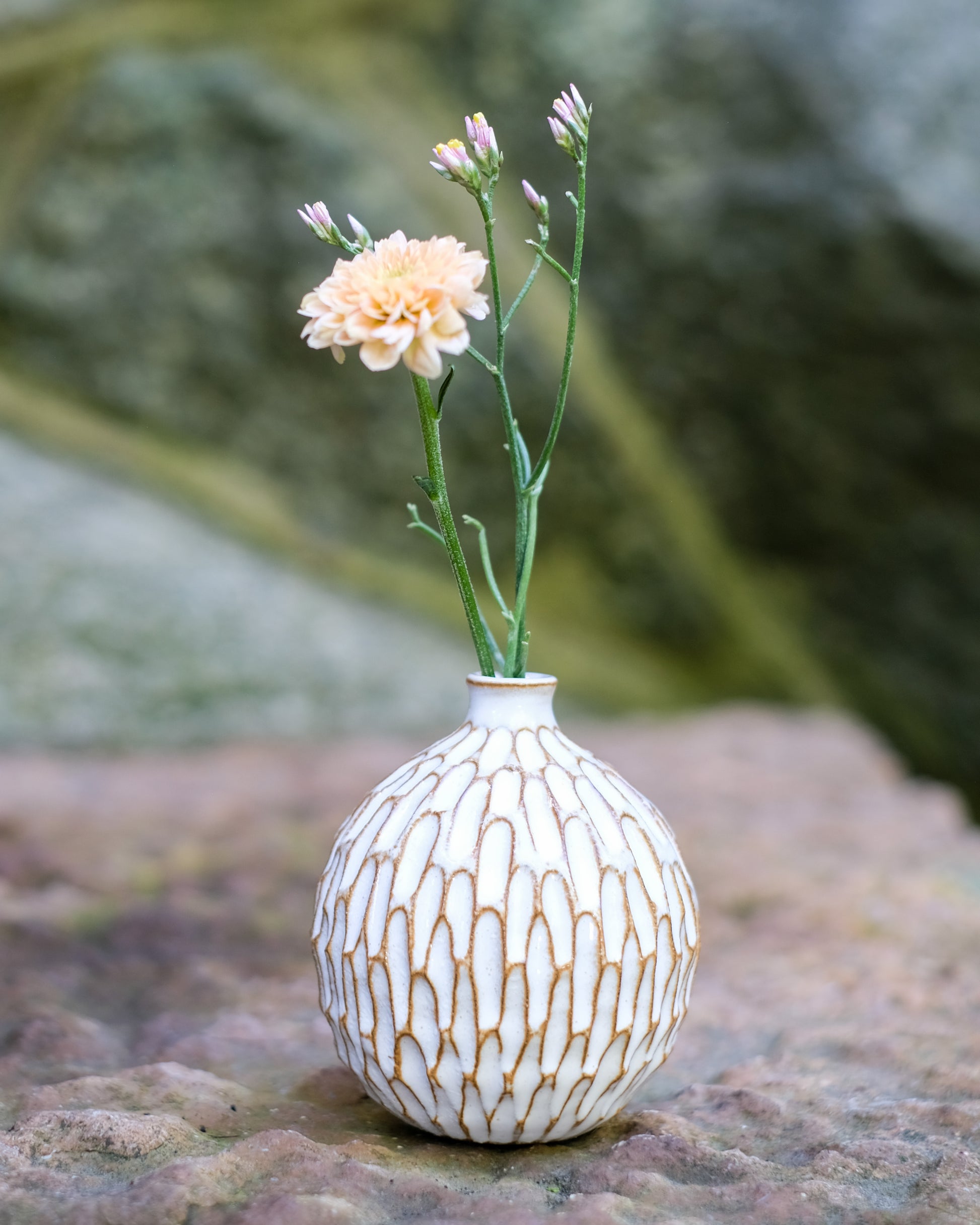 Drejad liten vas med handkarvat mönster i mörk stengodslera. Lämplig för snittblomma eller stickling. Höjd: ca 8 cm