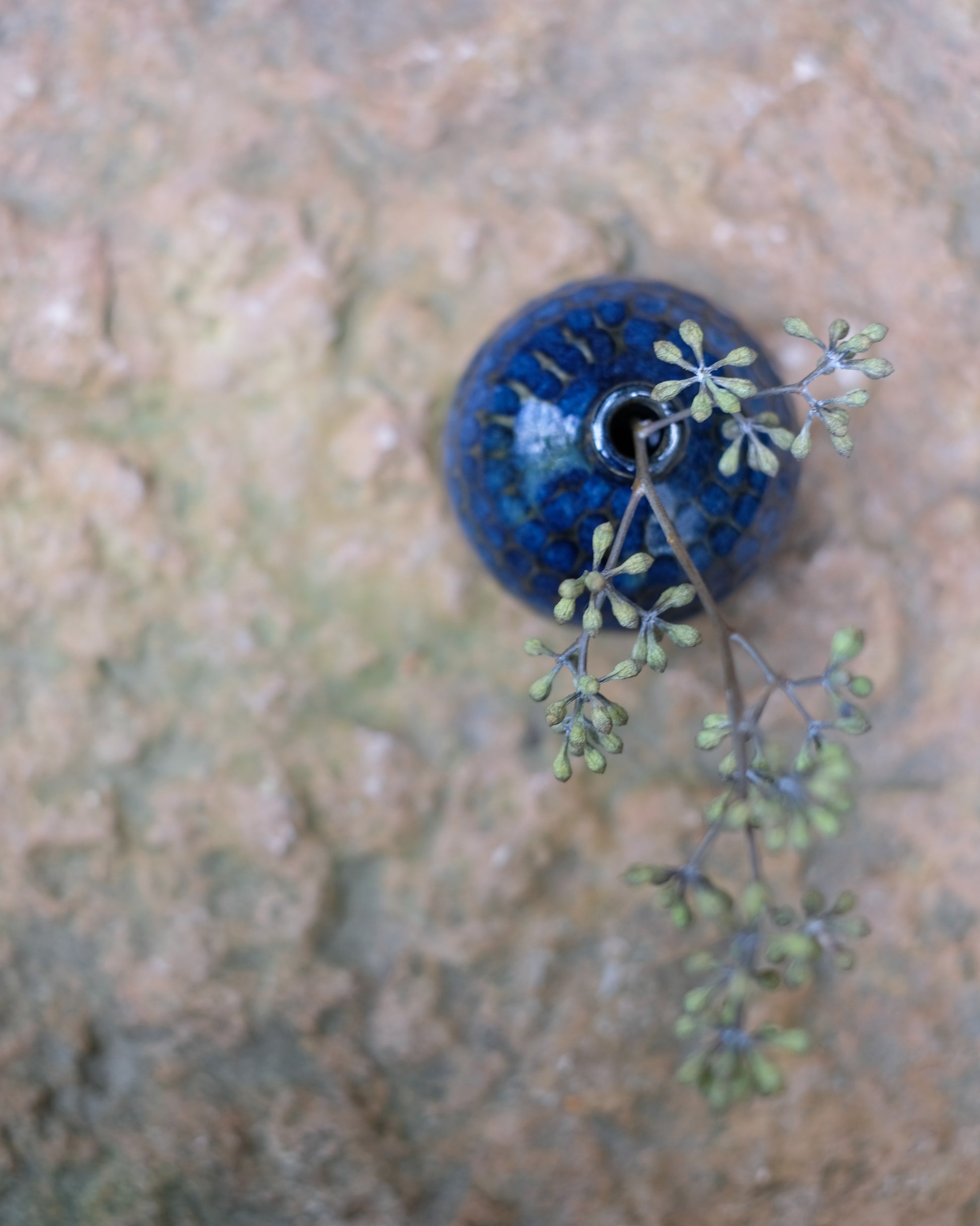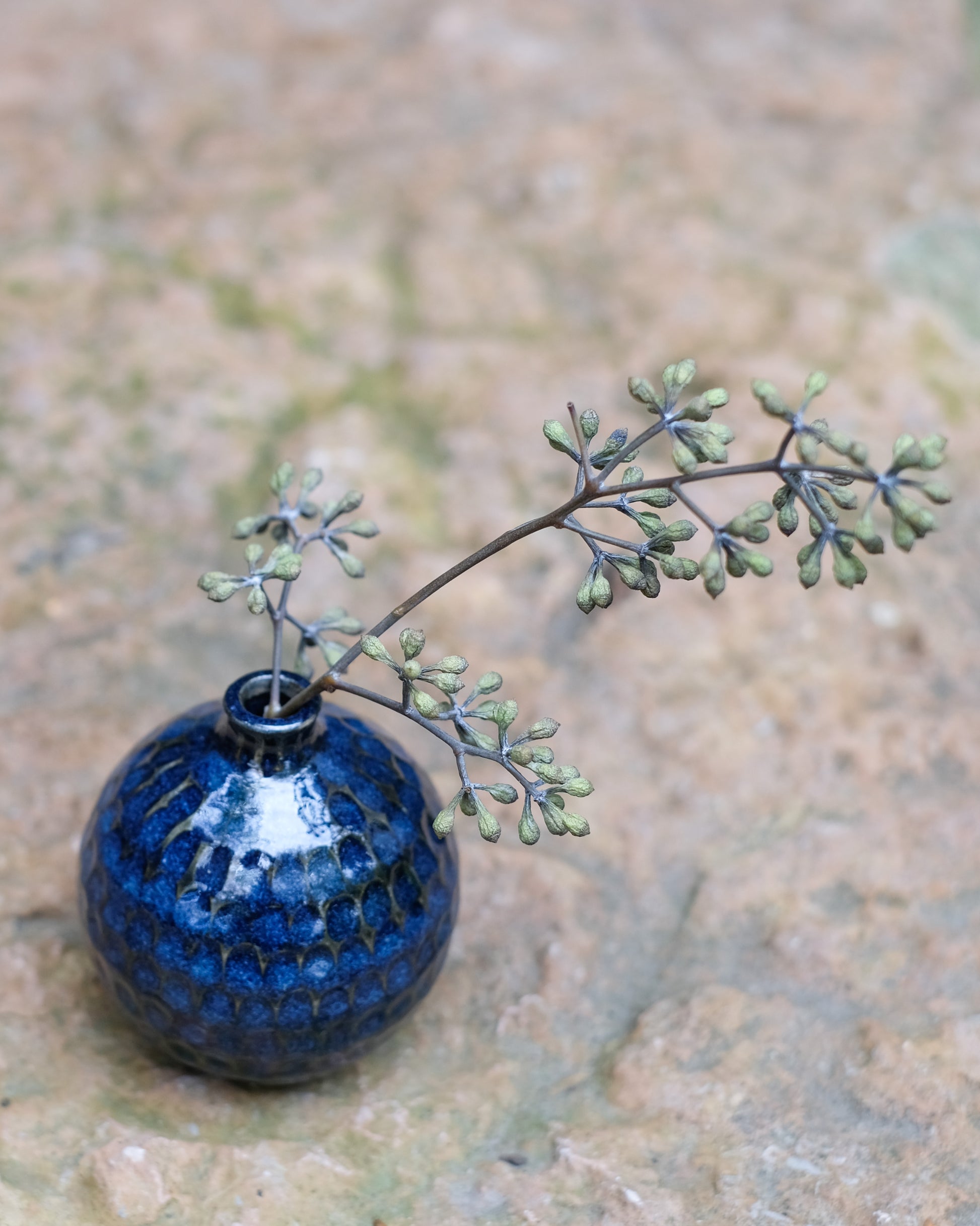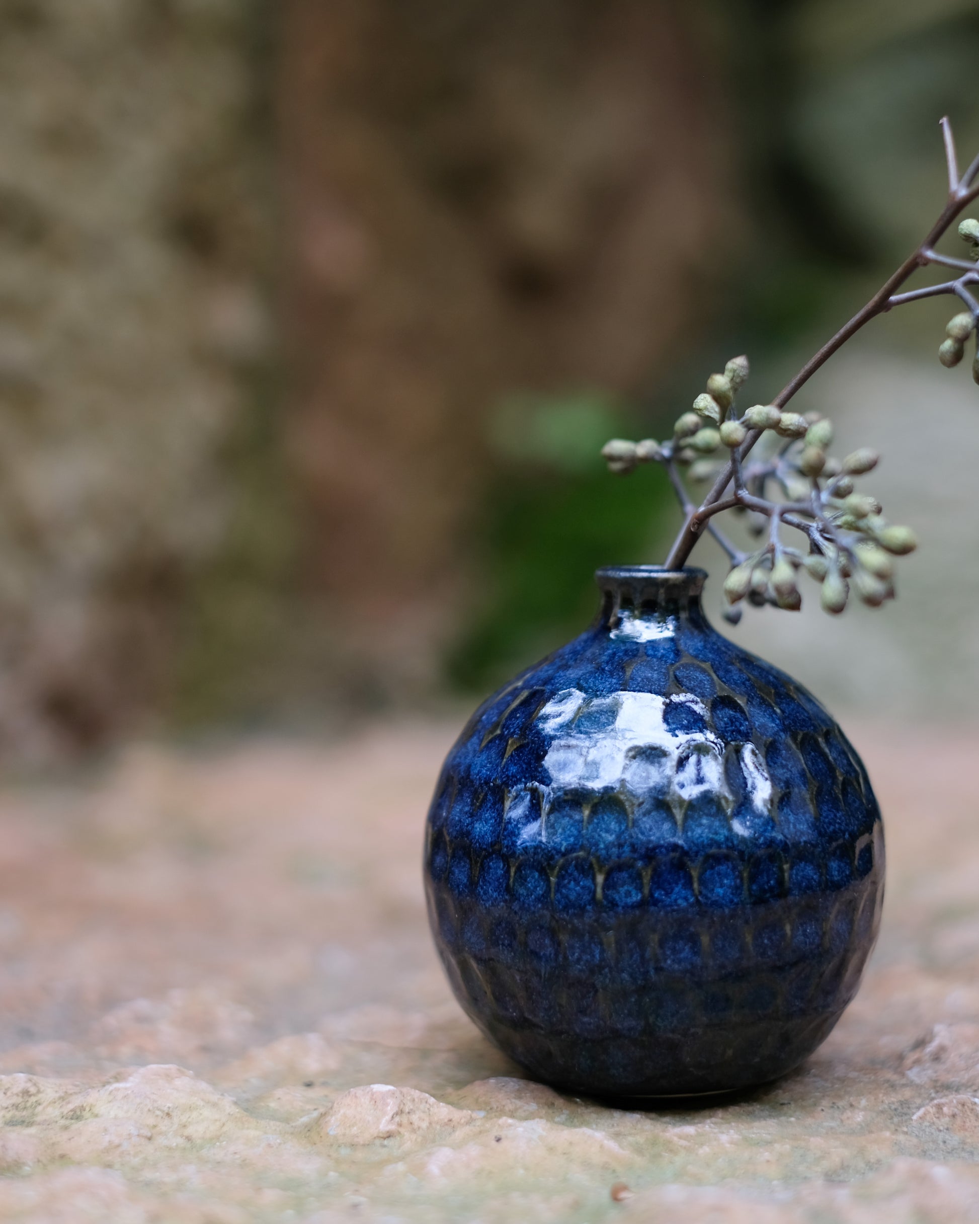 Liten drejad vas i stengodslera med karvad struktur. Blåmelerad. Lämplig för stickling eller snittblomma. Höjd ca 6 cm.