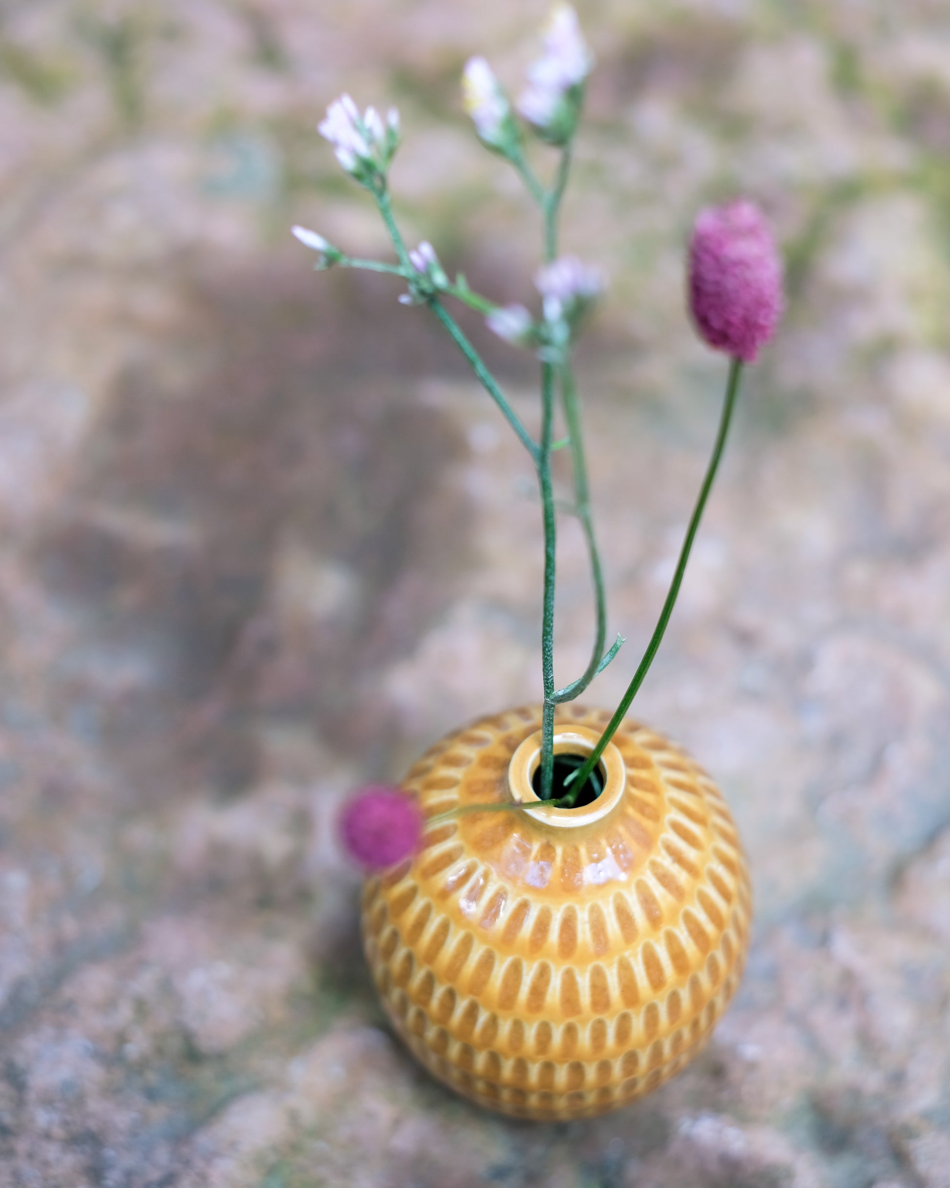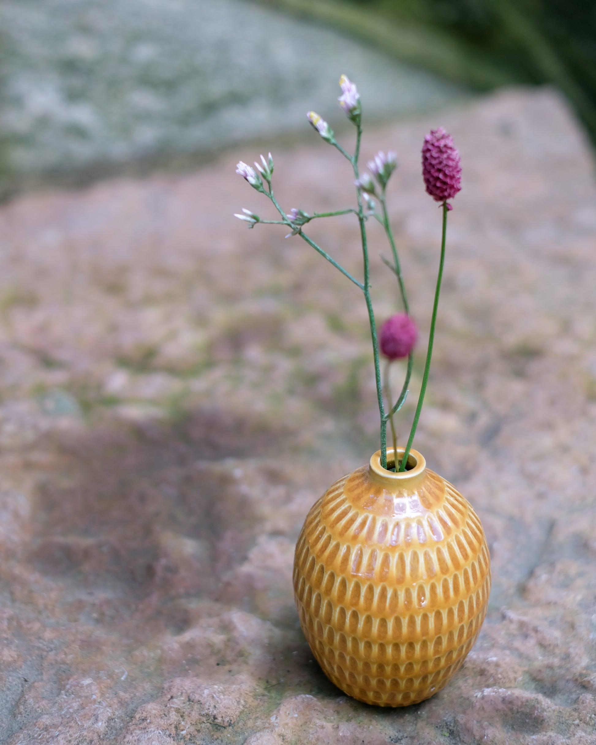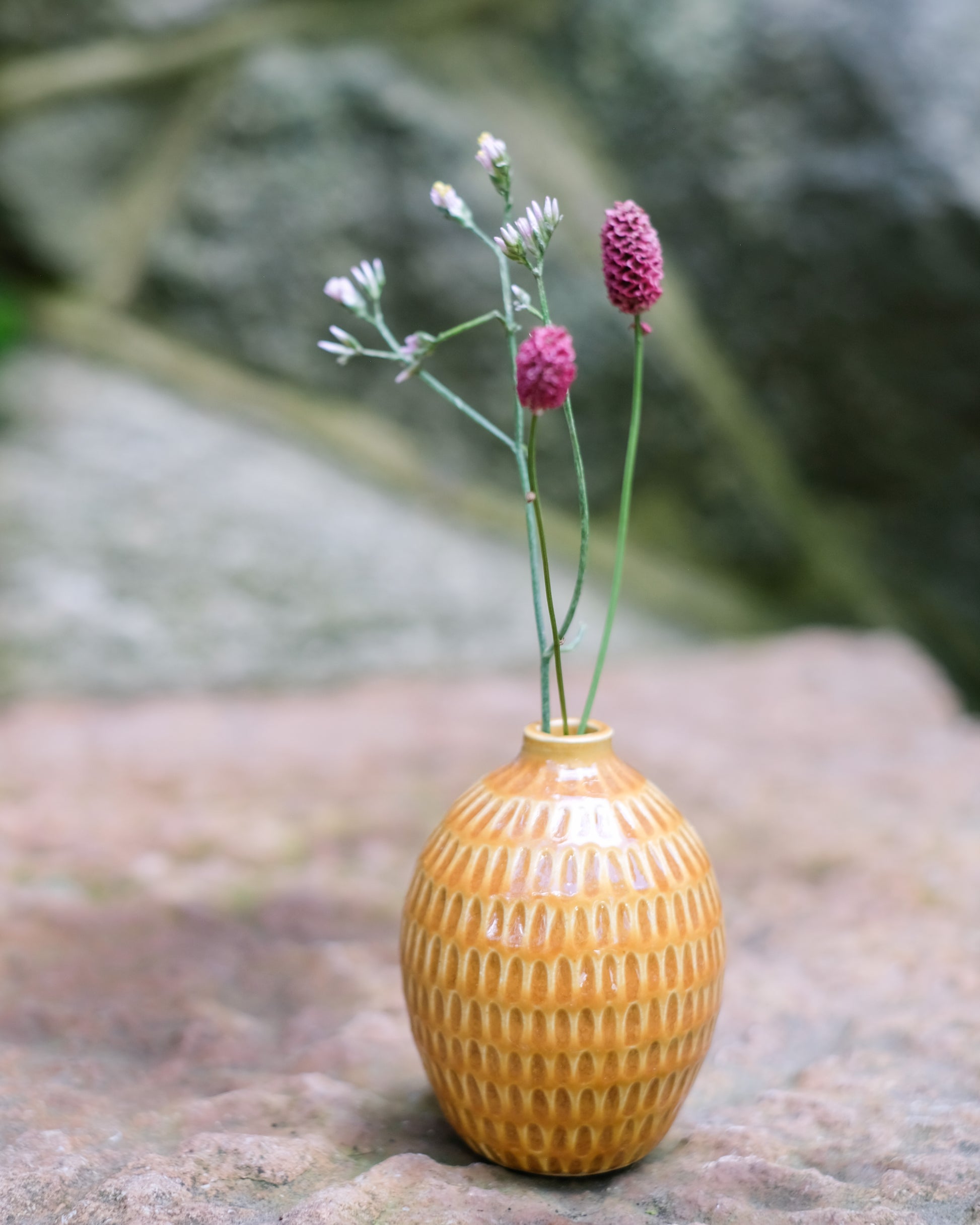 Liten karvad vas i ljus stengodslera. Senapsgul glasyr. Lämplig till snitt blomma eller stickling. Höjd: 8.5 cm