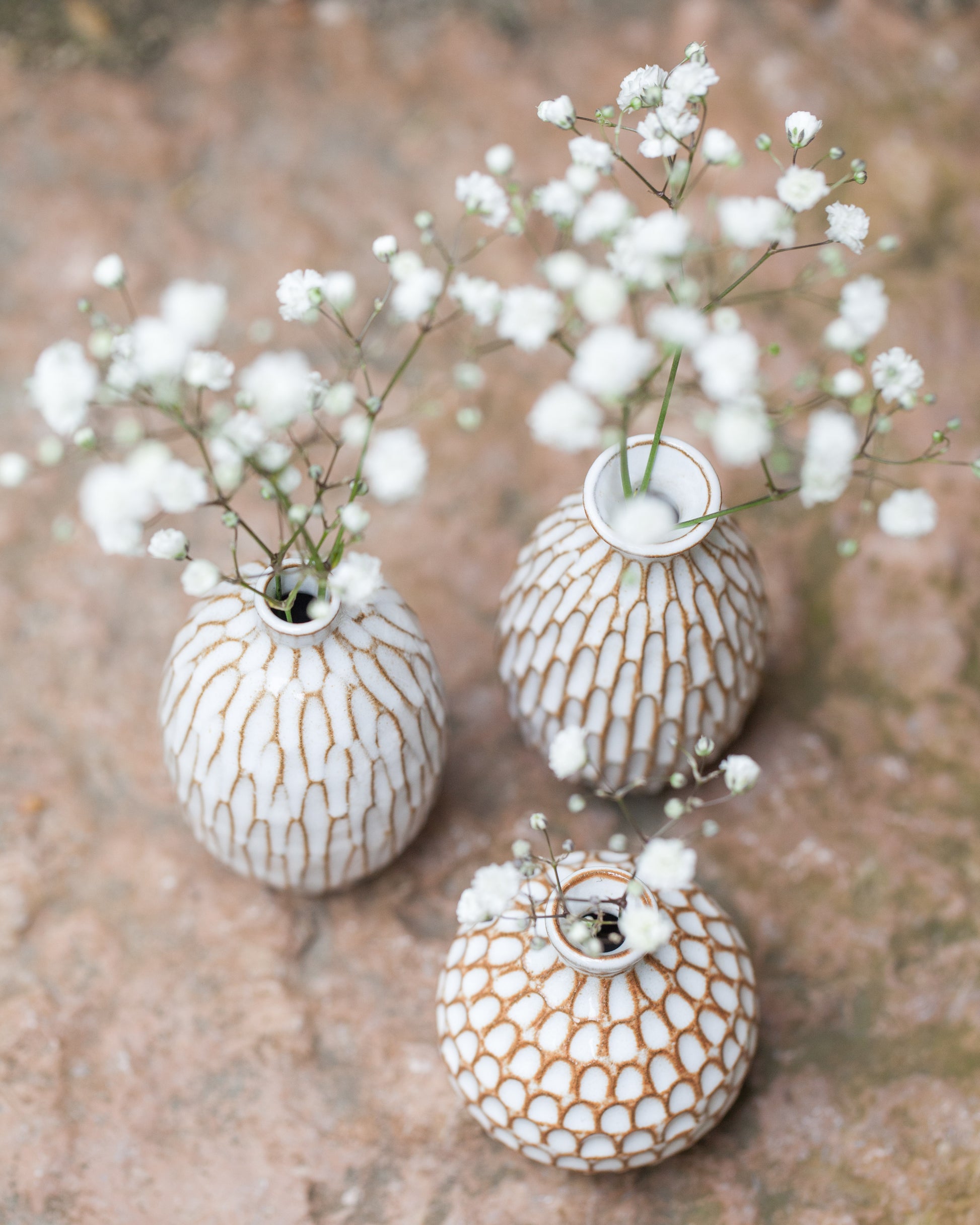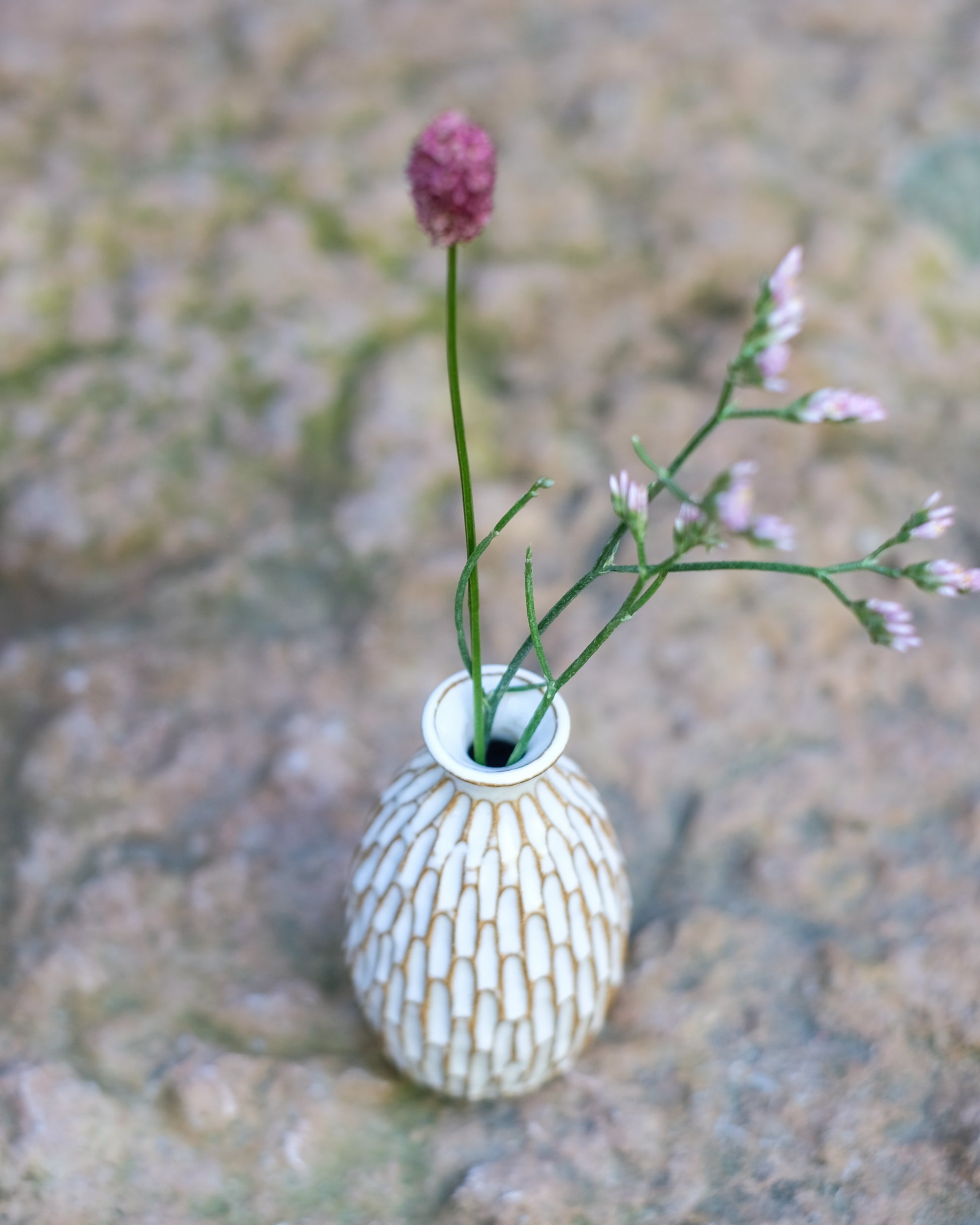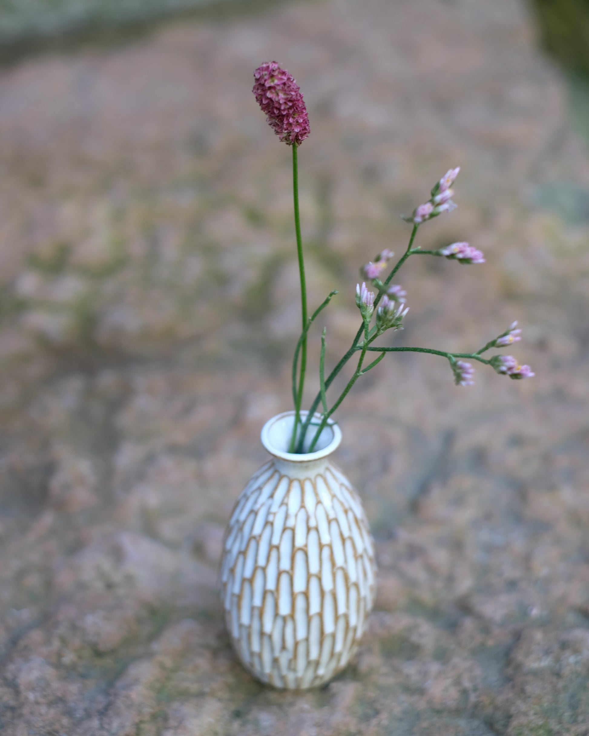 Liten karvad vas i mörk stengodslera. Vit glasyr. Lämplig för snittblomma eller stickling. Höjd: 9 cm