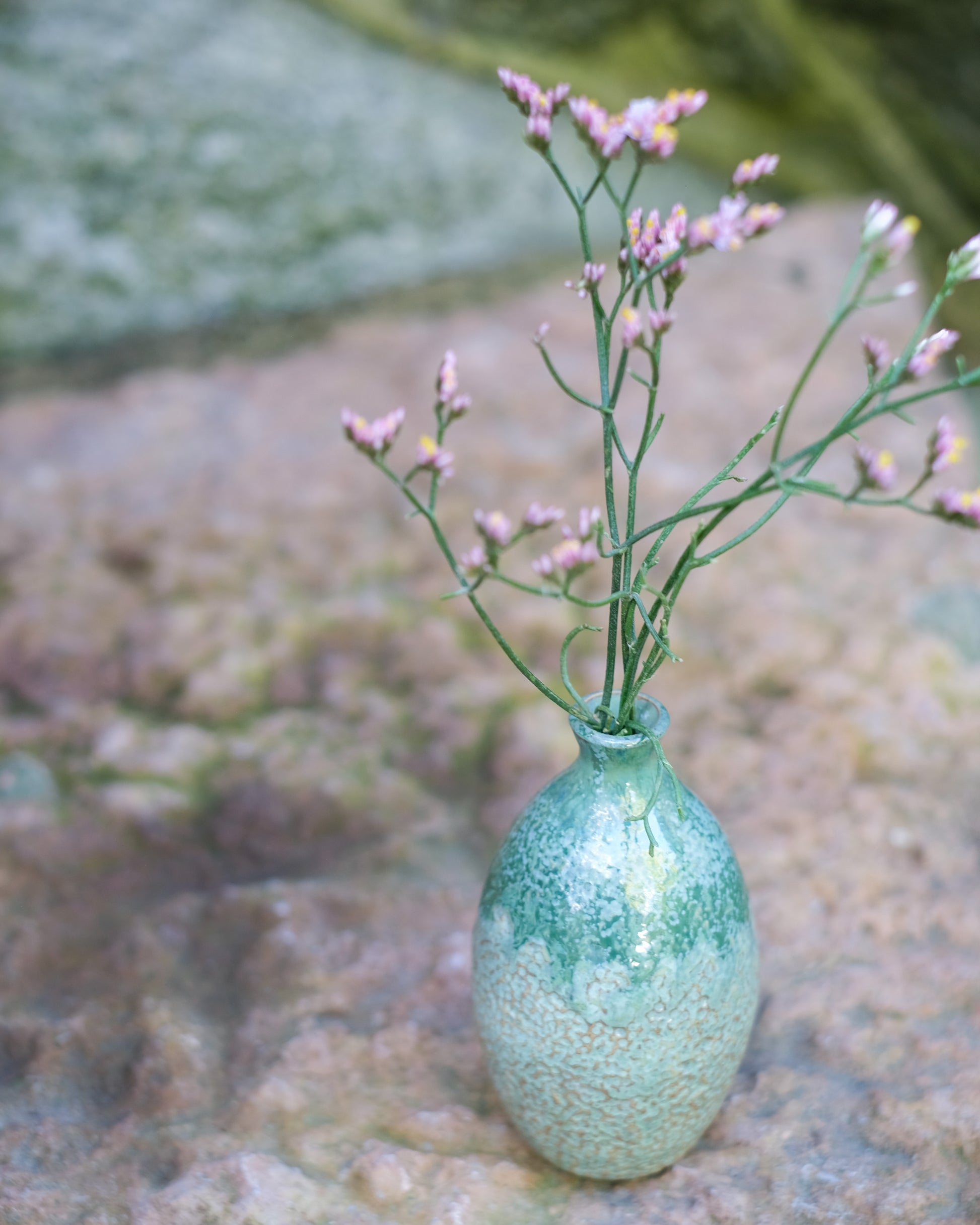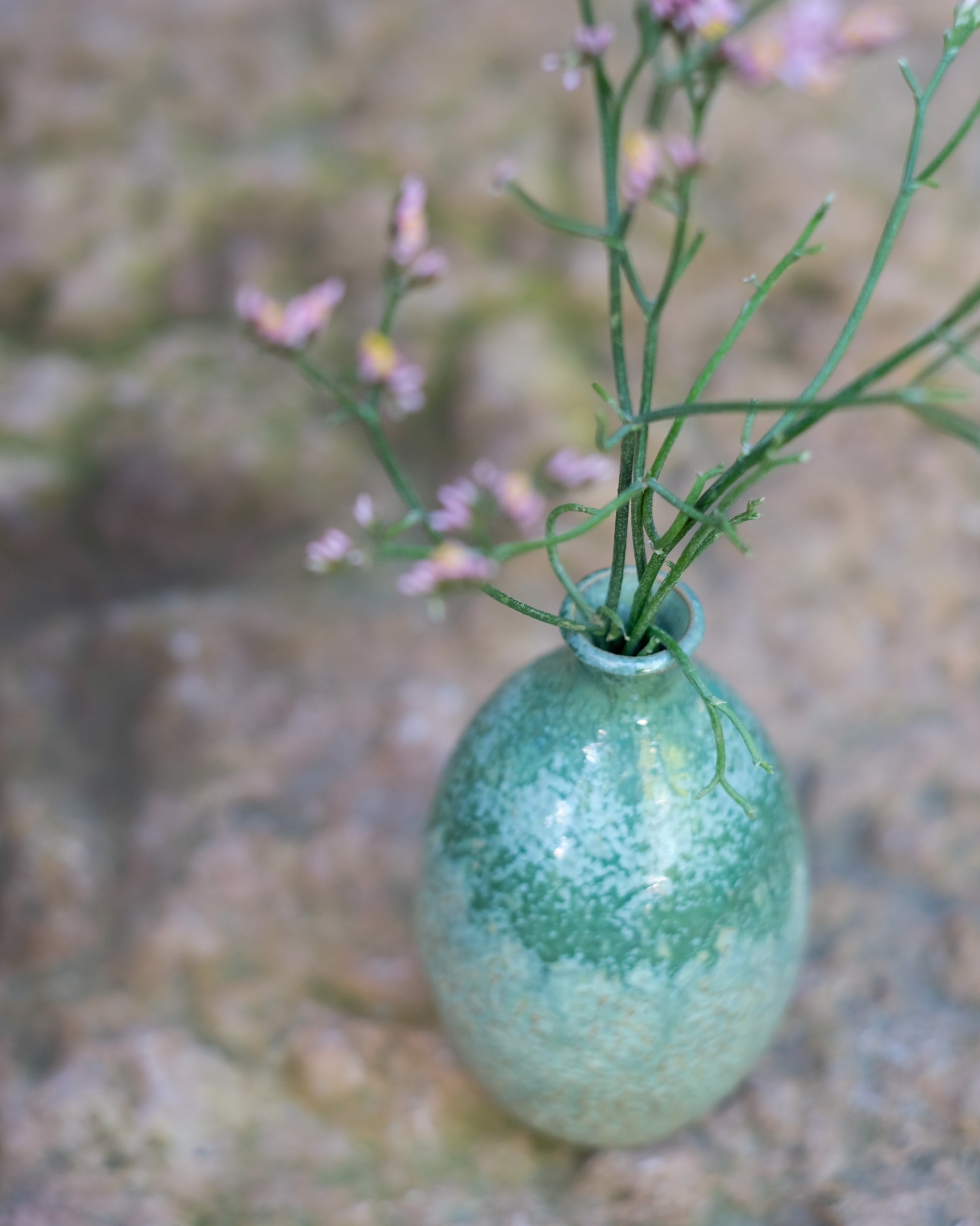 Drejad liten vas med handknackad struktur i ljus stengodslera. Lämplig för snittblomma eller stickling. Grönmelerad. Höjd: 9 cm