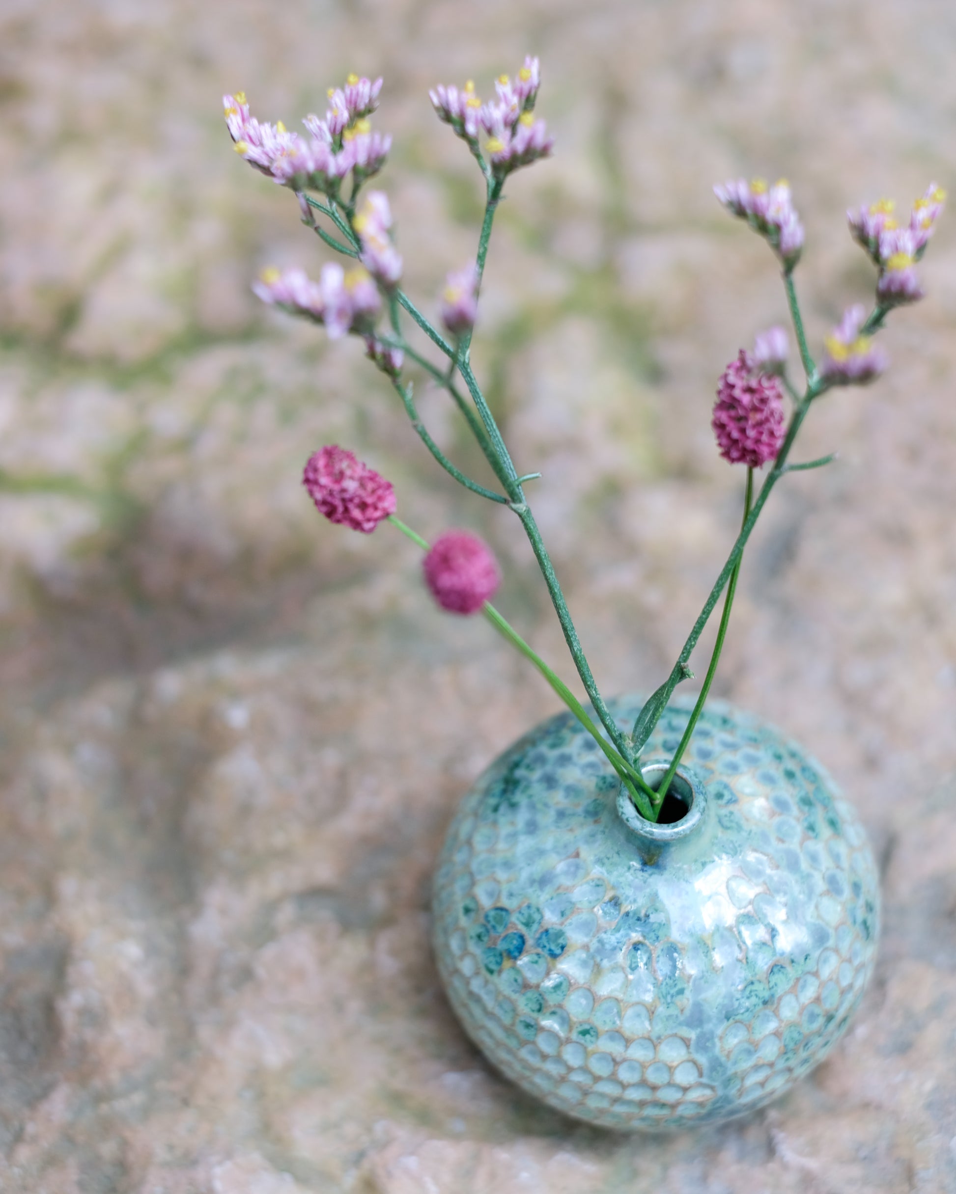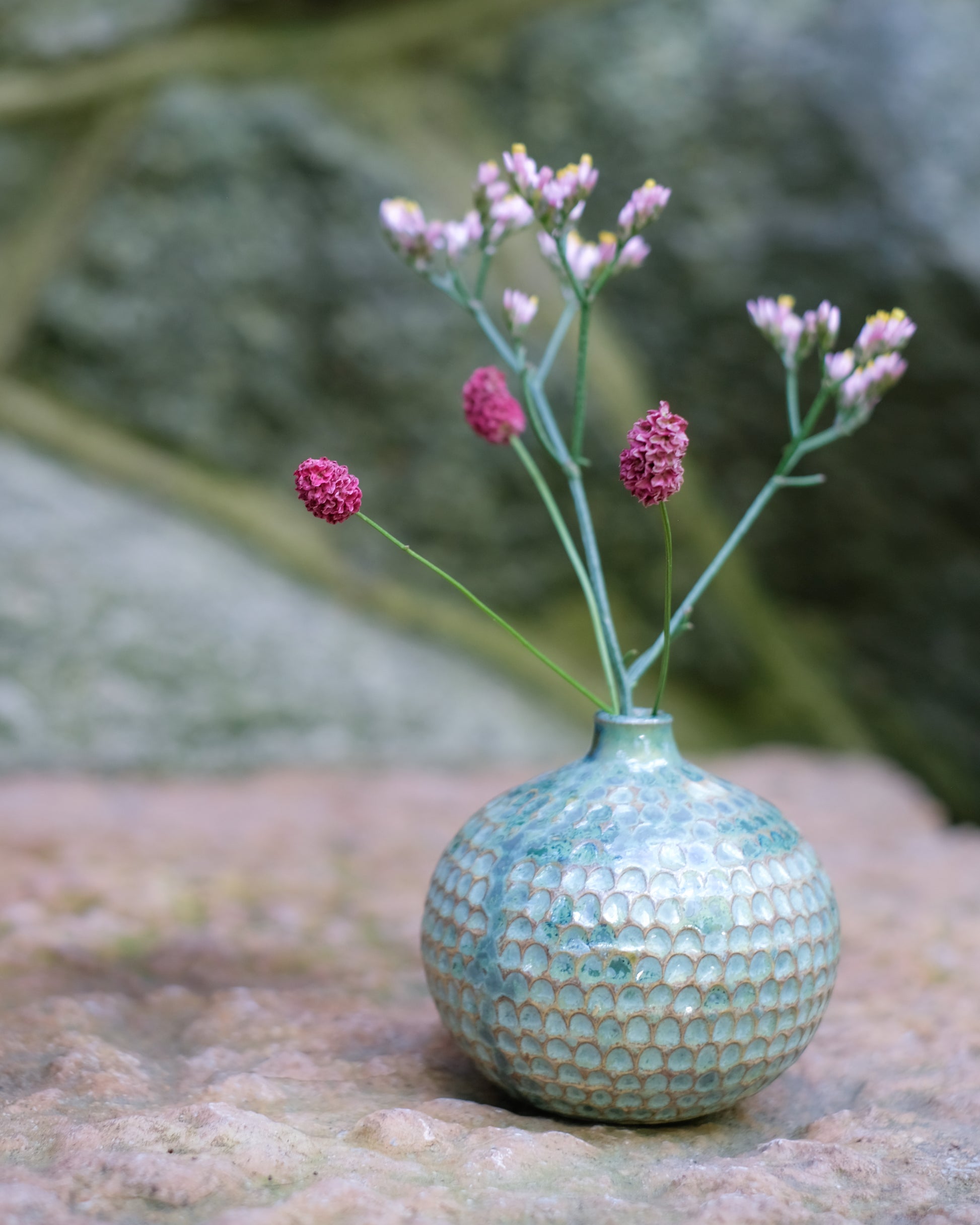 Drejad och karvad liten vas lämplig för snittblomma eller stickling. Glaserad i två olika gröna glasyrer. Höjd: ca 7 cm