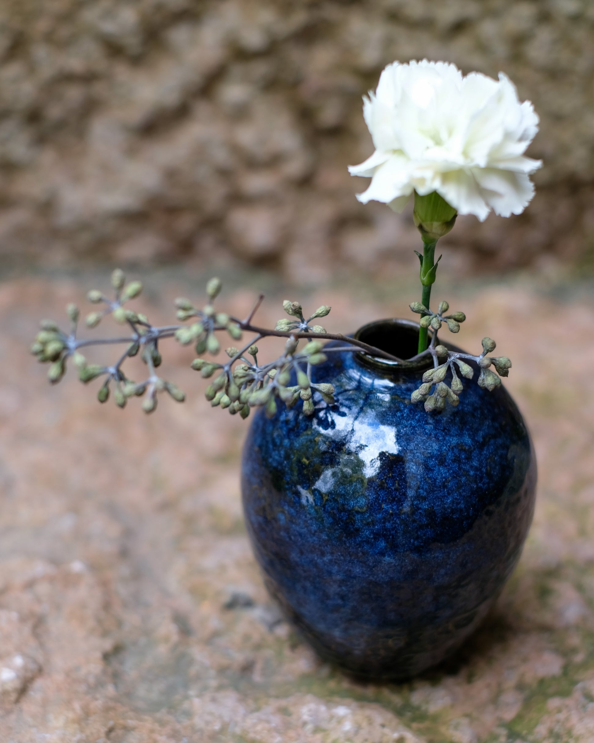 Drejad liten vas i stengodslera. Knackad struktur. Blåmelerad. Höjd ca 10 cm.