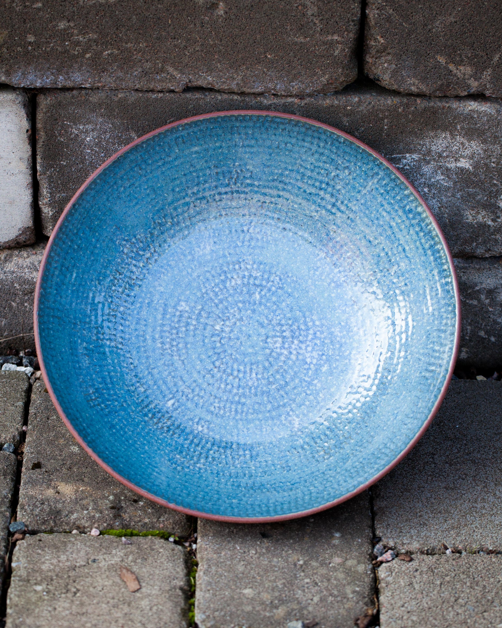 Stor drejad skål med karvad insida. Röd stengodsglasyr. Rå, oglaserad utsida. Blåglaserad insida.