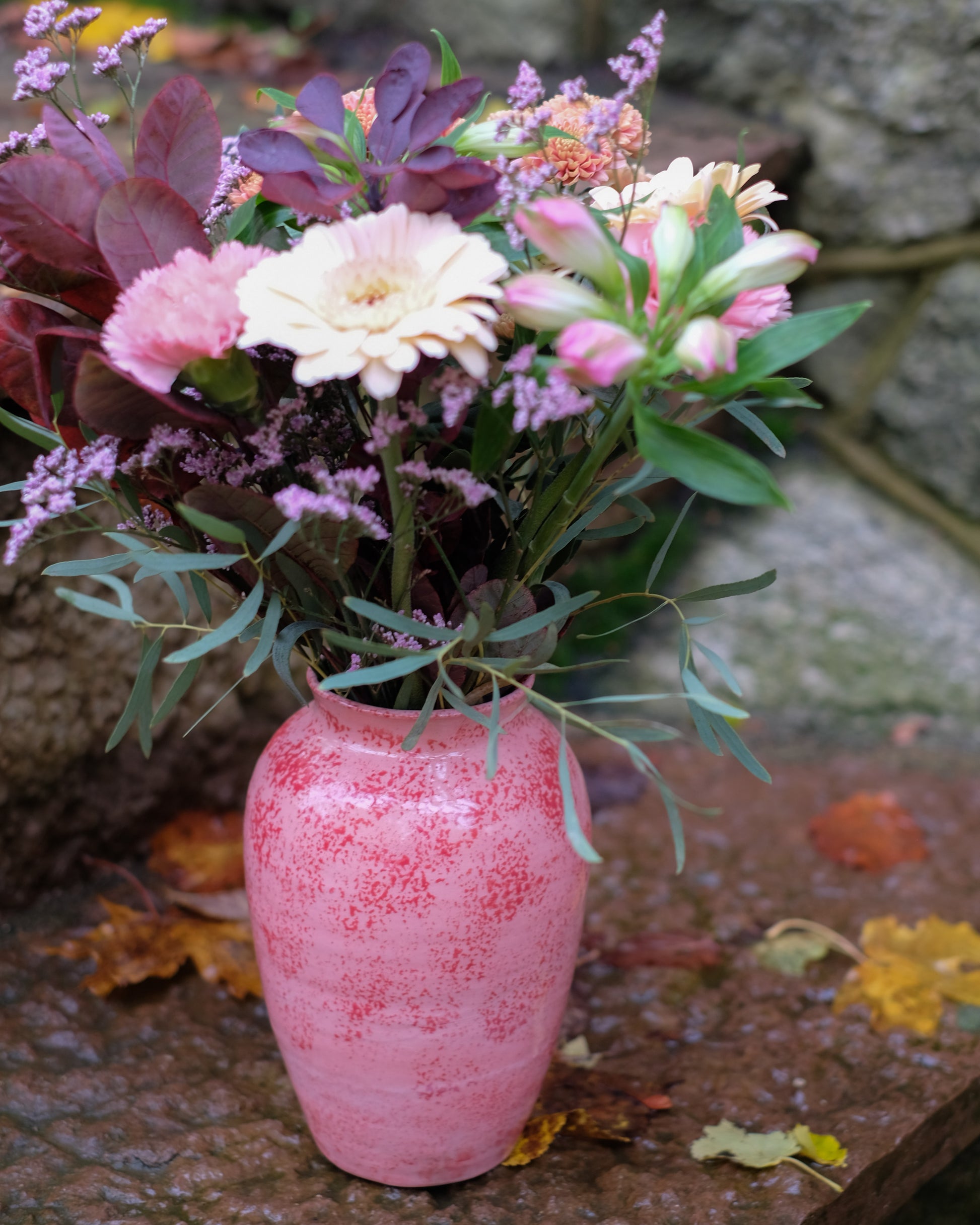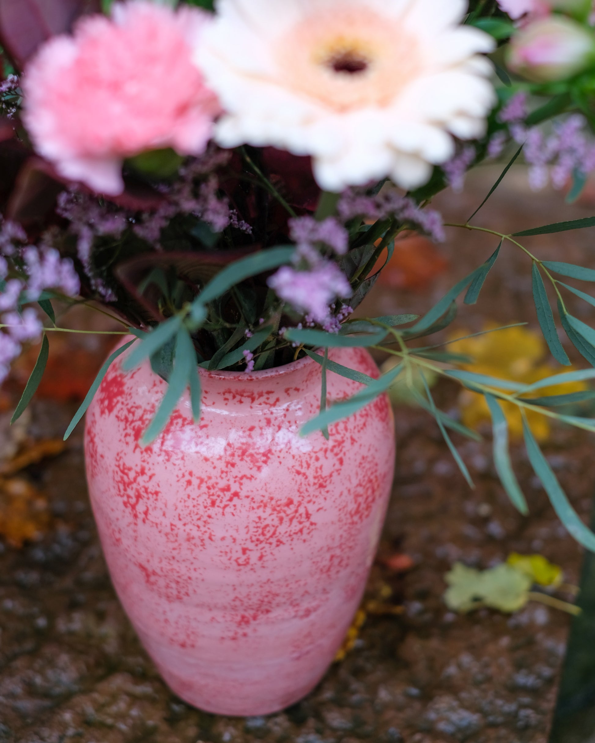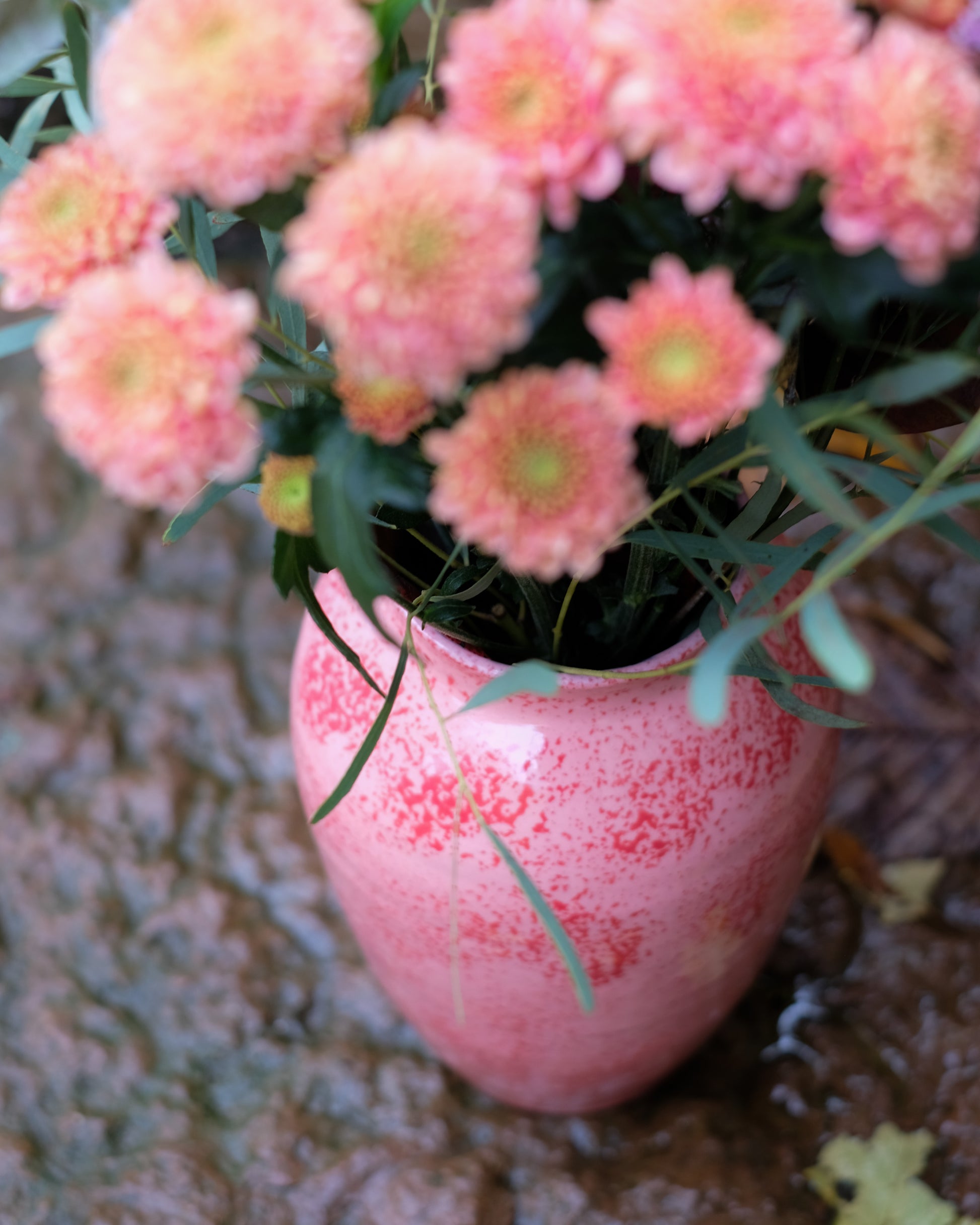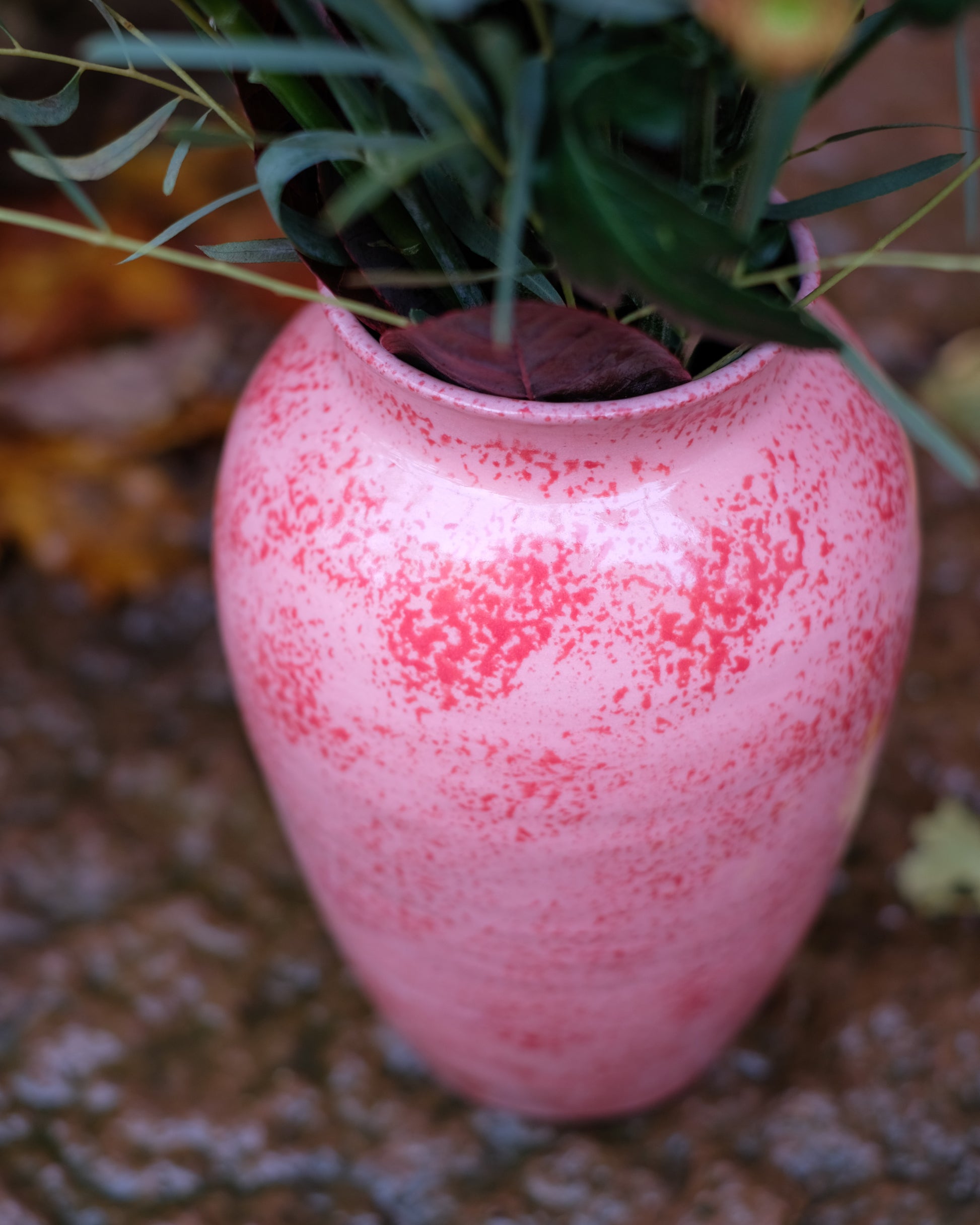 Drejad vas i ljus stengodslera. Engoberad med rosa engobe. Dekorerad med röd underglasyr och transparent glasyr. Höjd ca 20 cm.